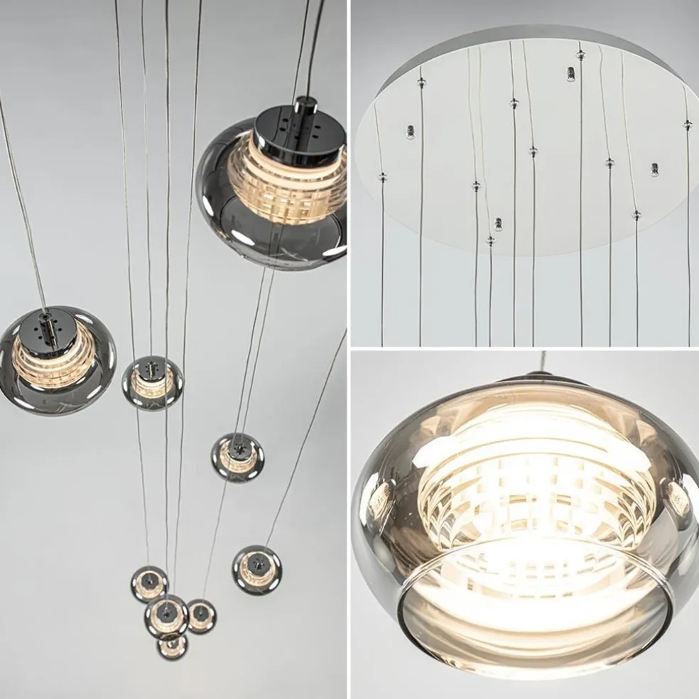 Deze 10-lichts glazen hanglamp vormt een mooie eye-catcher in een vide. De 10 smoke glazen kappen zijn mooi verdeeld over een hoogte van 3 meter en lopen in een spiraalvorm van boven naar beneden. De LED videlamp is voorzien van chromen details en smoke glazen kappen die de lamp een luxe uitstraling geven. Het heldere binnenglas zorgt voor een mooi effect in het smoke glas en tevens voor een fijne lichtverspreiding. Met 2700 Kelvin geeft de LED videlamp een sfeervolle warm-witte verlichting. Ideaal aan de moderne videlamp is verder, dat deze is voorzien van een 3-standen functie. Dit houdt in dat de verlichting in 3 standen is te dimmen d.m.v de gewone wandschakelaar. Per keer dat u de lamp aanzet, dimt deze een stap verder. Zo kiest u gemakkelijk en snel tussen de 3 standen en creëert u de ideale sfeer voor het juiste moment. De videlamp wordt met een grote ronde plaat aan het plafond bevestigd. De combinatie van het glas en het chroom maakt de videlamp geschikt voor divserse woonstijlen.