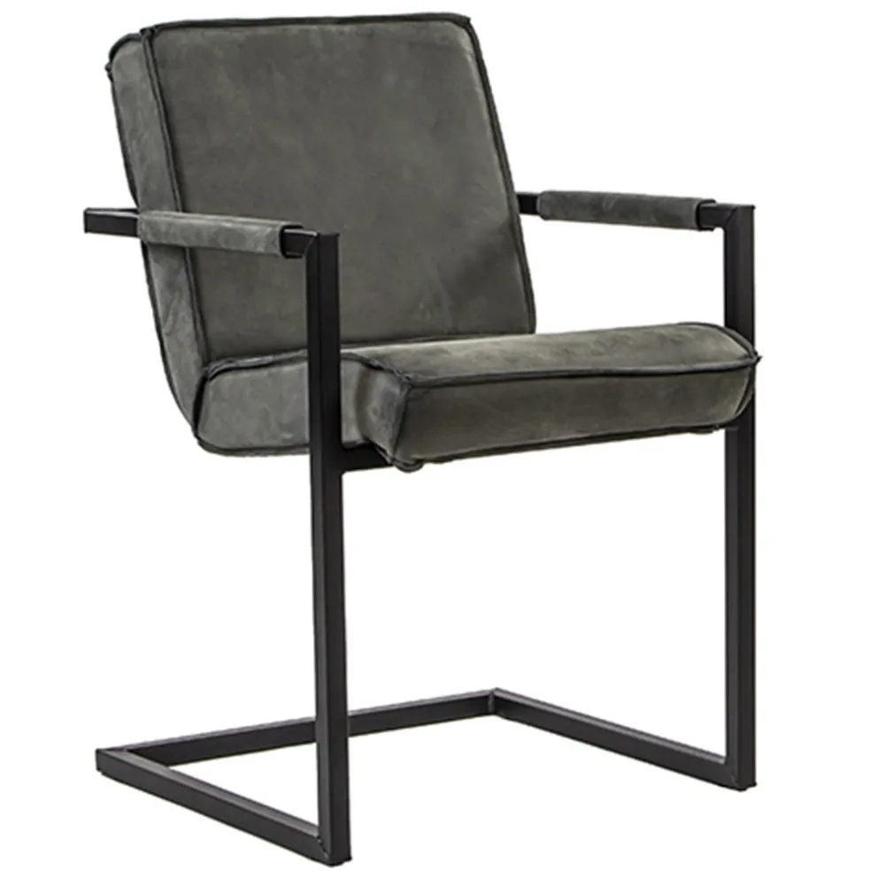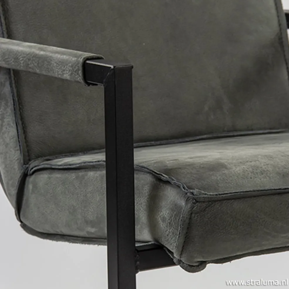 Een trendy modern/landelijke eetkamerstoel uitgevoerd in leder met metalen poten. Het olijf groene leder is van hoge kwaliteit en kan wel tegen een stootje. De dikke kussens zorgen in zowel de rug als de zitting voor een hoog zitcomfort en de metalen armleuningen die zijn voorzien van een leder stuk zorgen ook bij het natafelen voor een ontspannen en relaxte houding aan tafel.