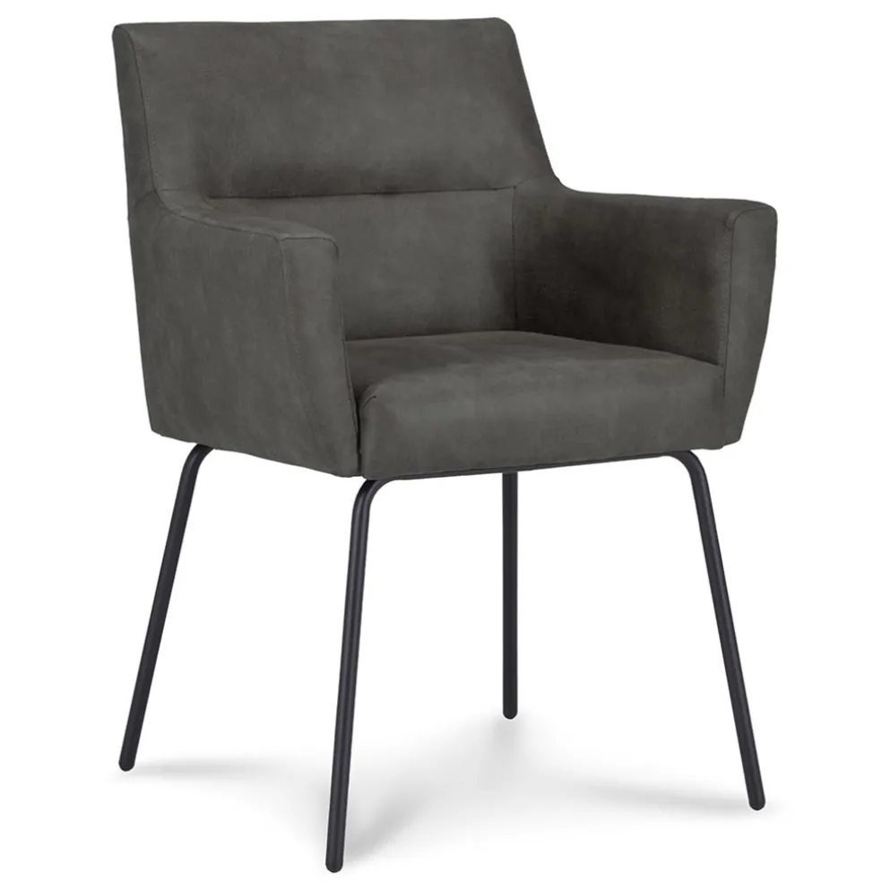 Deze armstoel heeft een fijne zitting met een hoog zitcomfort. De zitting is volledig gemaakt van bull leder en voelt enorm zacht aan. Bull leder, ook wel eco leer genoemd, is een combinatie van gerecycled buffelleer en polyester stof waardoor er een stevige kwaliteit ontstaat maar wel enorm zacht aanvoelt. Dit maakt het borrelen of genieten van een bak koffie wel heel erg fijn op deze eetkamerstoel. De poot is gemaakt van metaal en afgewerkt met een mat zwarte finish.