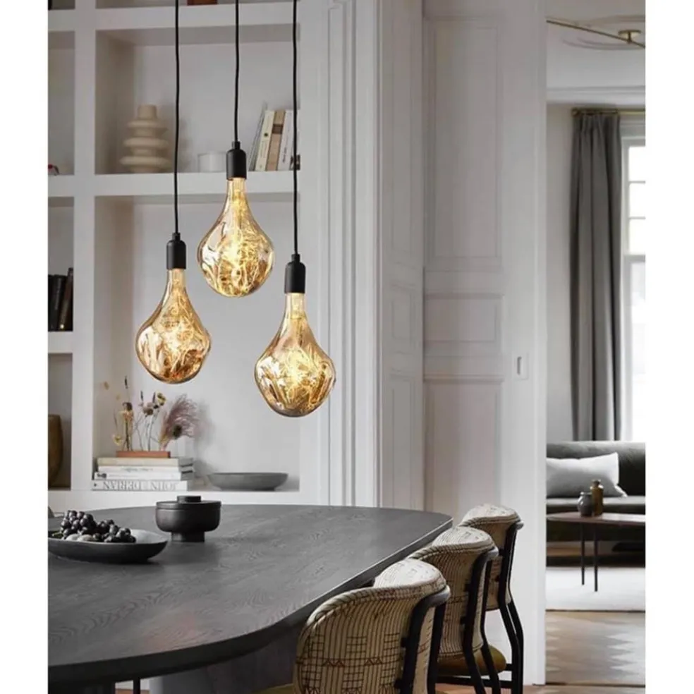Een surrealistische versie van de klassieke gloeilamp. Deze druppelvormige bron met champagne kleurig glas komt uit de XXL serie en past super in de bijpassende E27 cord sets met de retro pendels. Het spiegelende glas geeft de lamp een luxe design uitstraling.
