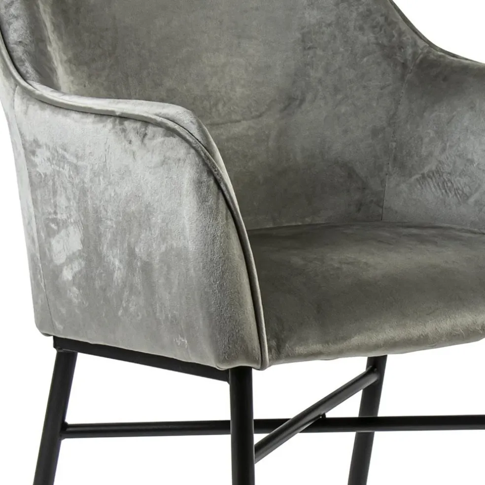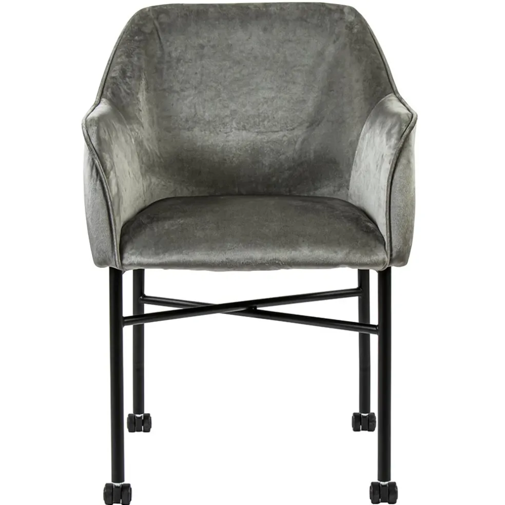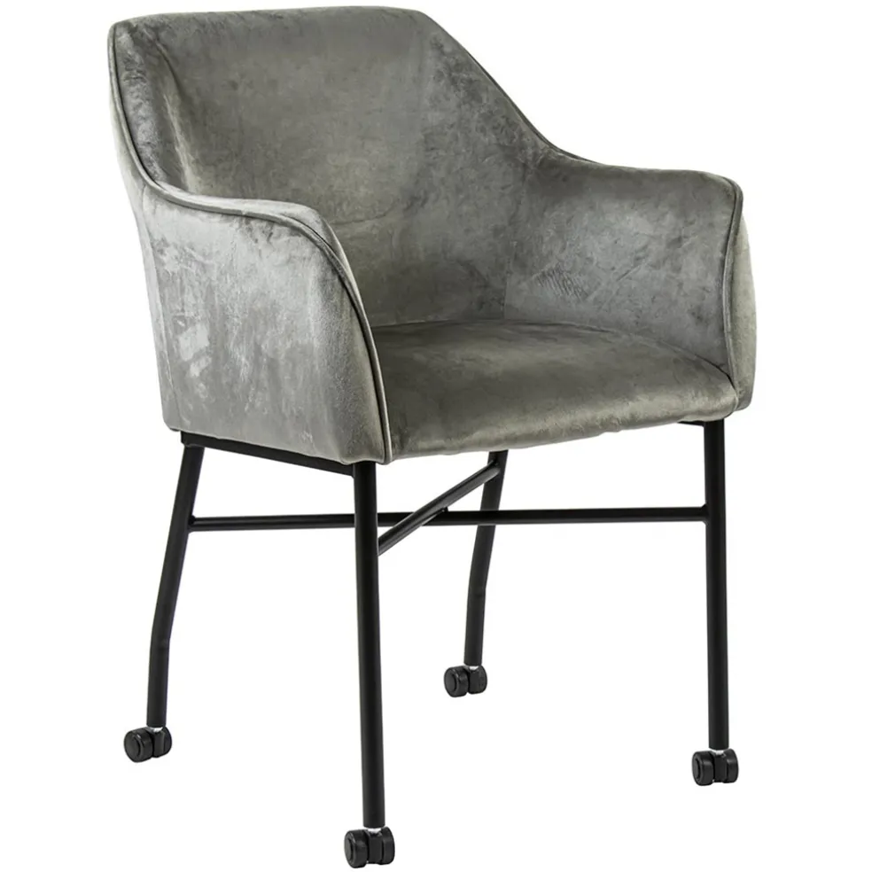 Heerlijk dineren en natafelen in deze eetkamerstoel is een waar genot. De armstoel heeft een comfortabele zitting die door de armleuning extra steun biedt. De kuip is volledig gemaakt van stof en uitgevoerd in het velours grijs. Het comfort van de trendy eetkamerstoel wordt vergroot door de wieltjes onderop de poot waardoor u gemakkelijk kunt aanschuiven. De poot is gemaakt van metaal en voorzien van een mat zwarte finish.