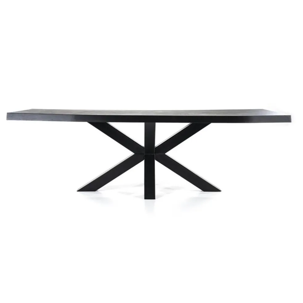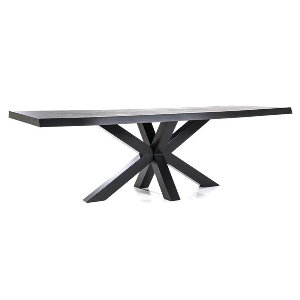De trend van de boomstamtafel zien we al enige tijd. Maar nu is er een nieuwe variant, namelijk de zwarte boomstamtafel. De tafel bestaat uit een robuust eiken houten blad met een afmeting van 240×100 cm. Het blad is 6 cm dik voor een extra grove look. Dit maakt de tafel dan ook prima geschikt voor diverse woonstijlen als luxe, landelijk of industrieel. De metalen spinpoot maakt de eettafel helemaal af. Ook deze is in het zwart uitgevoerd. De rechthoekige boomstamtafel zwart biedt genoeg ruimte voor 6 stoelen.