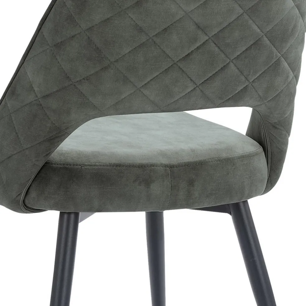 Chique, trendy en comfortabel. Deze fijne stoel zorgt met het wat dikkere zitkussen voor een fijne zit die wordt versterkt door de rugleuning. Deze is van onder open voor een mooi open effect. De zitting en de rugleuning zijn volledig van een velourse stof wat een chique luxe uitstraling geeft. Het stiksel op de rug geeft hier nog extra allure aan. De eetkamerstoel is verder afgewerkt met zwarte pootjes.