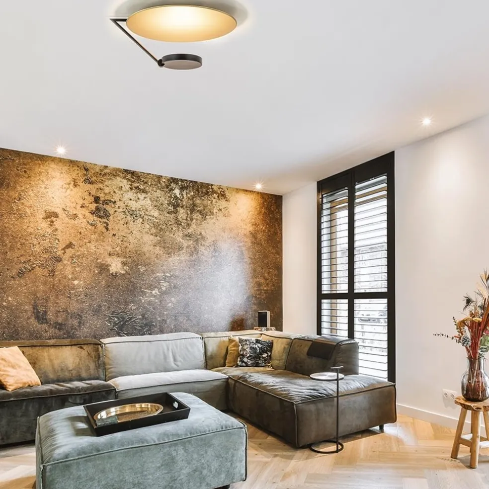Deze grote design plafondlamp is een sfeermaker in de ruimte. De plafondlamp is voorzien van geïntegreerd LED en geeft indirecte verlichting. Hierdoor ontstaat er een sfeervol effect. Het licht wordt weerkaatst op de gouden plaat waardoor het ook een warme uitstraling krijgt. Door z’n formaat is de lamp prima geschikt voor een hal of kleine kamer. De LED plafondlamp zwart met goud is dimbaar middels de juiste dimmer (exclusief).