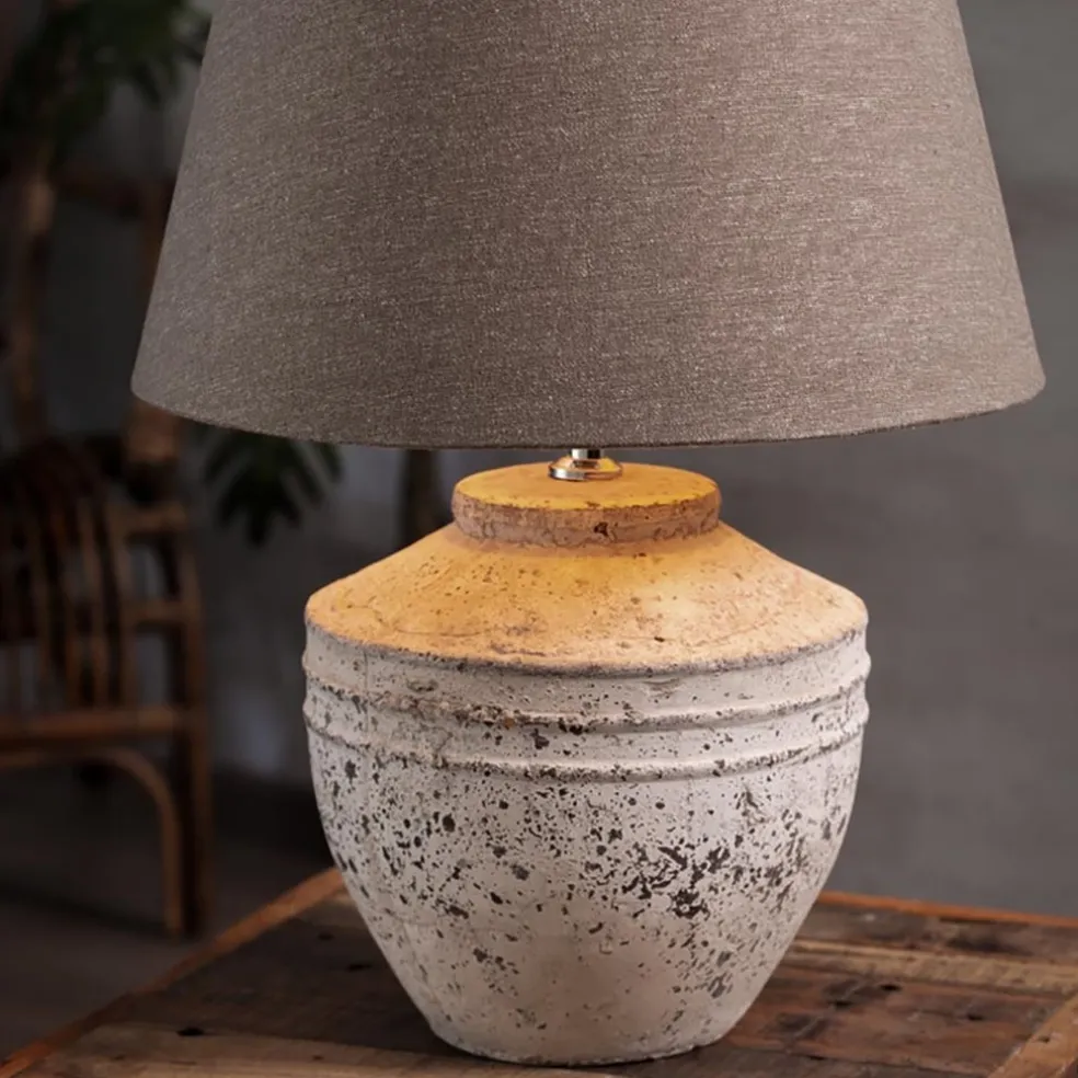Trendy lifestyle voet voor tafellamp Toba. Deze betonnen lampenvoet heeft een grove structuur en is grijs-wit van kleur waardoor hij uitstekend in een lifestyle of landelijke inrichting past. Deze lamp wordt geleverd exclusief lampenkap. Op de foto’s kunt u wel een voorbeeld zien hoe deze tafellamp eruit ziet met kap. U kunt deze tafellamp combineren met een kap naar eigen keuze.