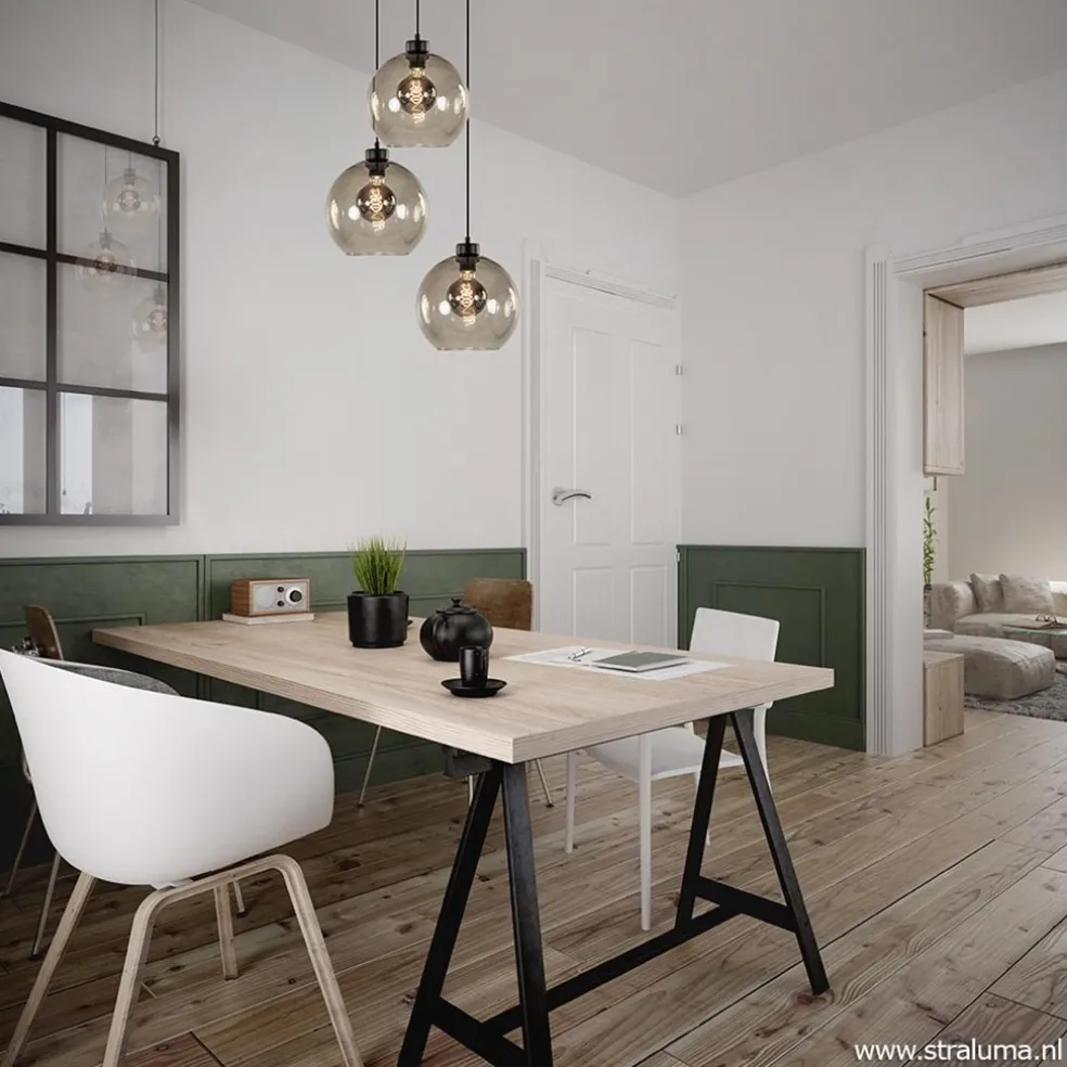 Glas is trending, glas is hip. Vooral gekleurd glas doet het goed en zorgt voor veel sfeer in huis. Zo ook deze luxe 3-lichts hanglamp. De lamp leent zich prima voor ruimtes met een hoog plafond boven een ronde eettafel of bijvoorbeeld een vide. De hanglamp heeft drie smoke (antraciet) glazen kappen die ieder op gewenste hoogte zijn te hangen. De kappen hangen aan een zwart snoer en de lamp wordt met een ronde plafondplaat bevestigd. De luxe uistraling past mooi bij een modern of design interieur.
