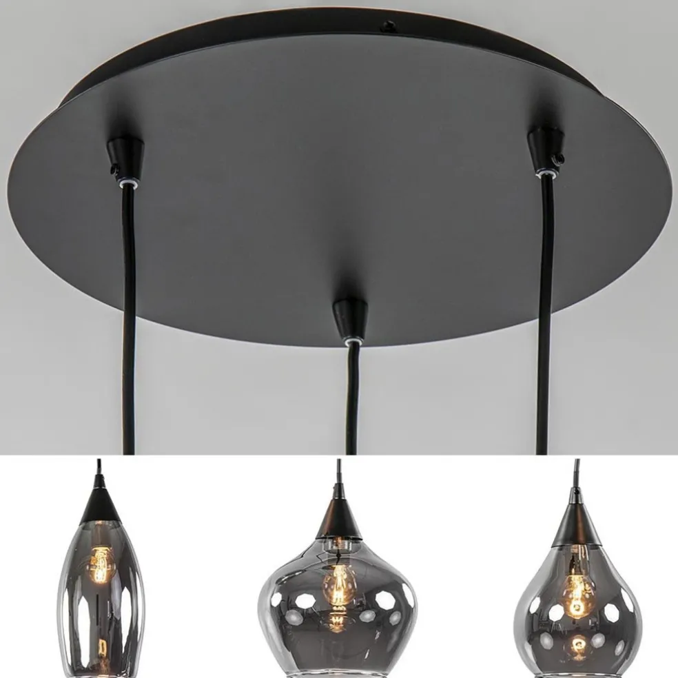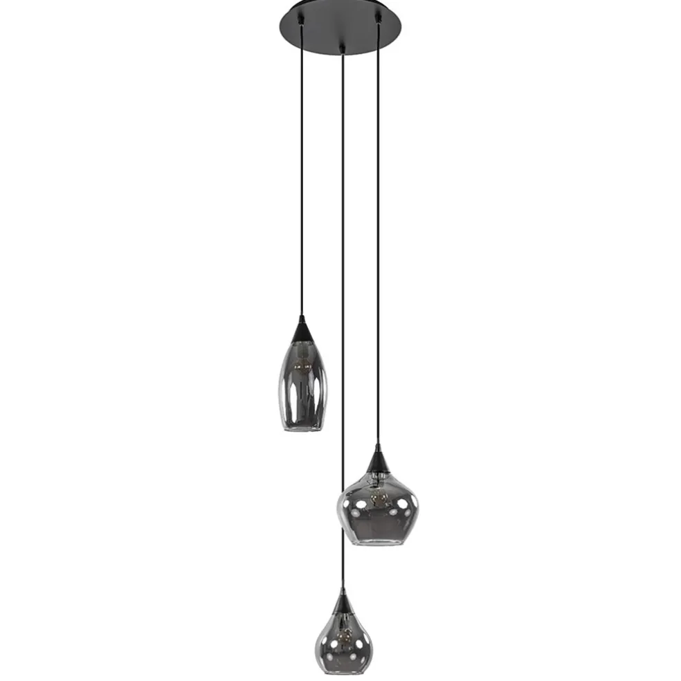 Strak-klassiek, modern, een beetje industrieel en luxe in één. Deze moderne 3-lichts hanglamp is in diverse woonstijlen toe te passen. De hanglamp bestaat uit een zwart metalen plaat met zwarte snoeren en pendels. Het zwart is mooi gecombineerd met smoke/titanium glas wat de lamp die luxe uitstraling geeft. De verschillende kappen zijn ieder voorzien van schroefdraad zodat u ze gemakkelijk aan de fitting kunt bevestigen. Het spiegelende glas wordt donker transparant zodra de lamp wordt ingeschakeld. De 3-lichts hanglamp heeft een maximale hoogte van 175 cm en is naar wens in te korten. Zo kunt de de lamp gemakkelijk ophangen waar u wilt.