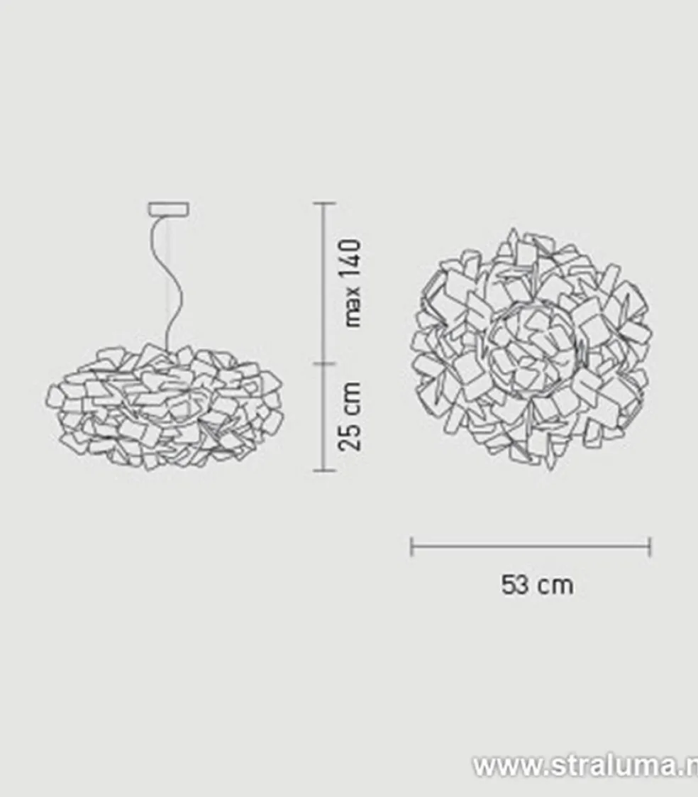 Prachtig Italiaans design en vervaardigd van hoogwaardig kunststof. Deze prachtige design hanglamp is als een wolk van licht. Hij neemt bezit van de ruimte, en geeft deze een heel nieuw karakter. De elementen lijken volledig willekeurig samegesteld, maar volgen een zeer precieze compositie. Deze sprankelende design lamp heeft een mooie balans van transparant en semi-transparant, in een fantastische rookkleur. De lamp hangt met een transparant snoer en staalkabel aan de witte plafondbevestiging.