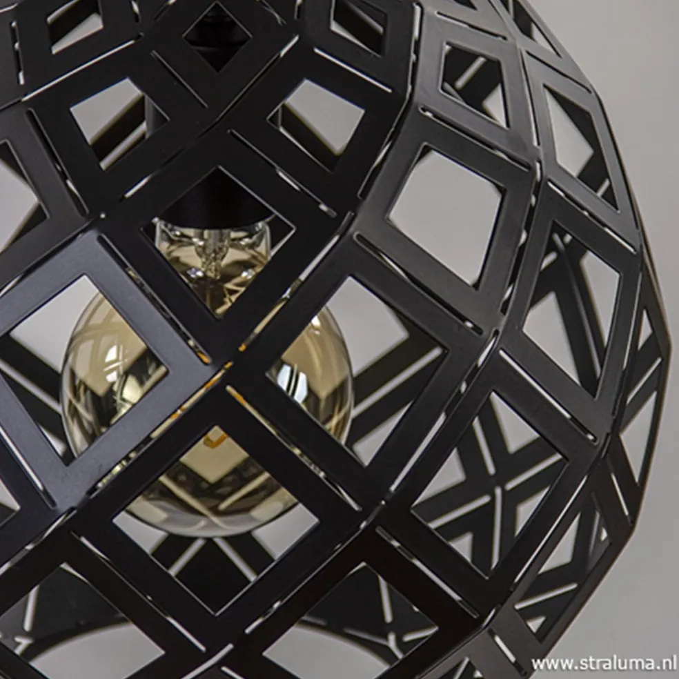 Deze metalen hanglamp geeft een Scandinavisch tintje aan het interieur. De mat zwarte hanglamp heeft door de open structuur een gevlochten effect wat de kap een speelse uitstraling geeft en een mooie lichtverdeling produceert. De ronde kap heeft een rechte onderkant met grote opening waardoor het makkelijk is om de lichtbron te vervangen. De bovenzijde van de kap is dicht en verloopt in het zwarte strijkijzersnoer en de plafondbevestiging. Dit leuke lampje leent zich prima voor kleine ruimtes als een hal, overloop of toilet.