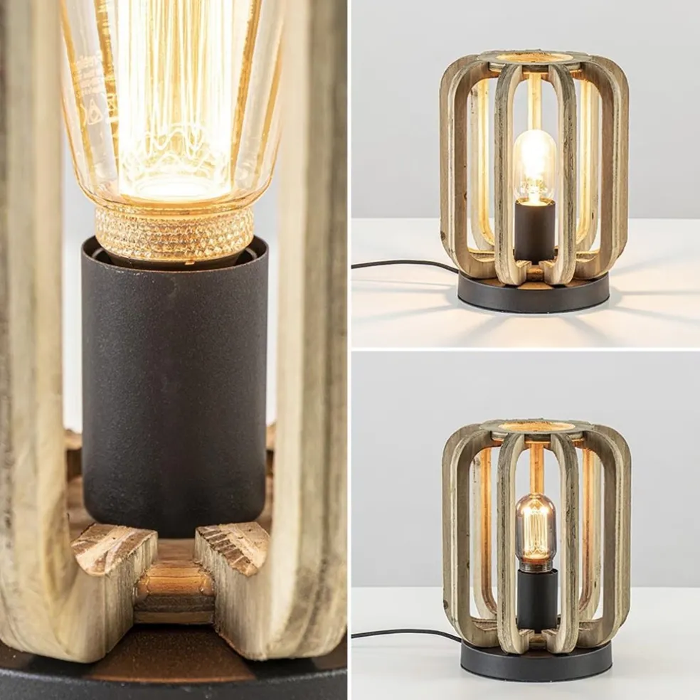 Een leuke sfeermaker voor in een kast of op een bijzettafel. Deze kleine tafellamp heeft een stoer karakter die mooi is te combineren in een industrieel of landelijk interieur. De houten kooi heeft een ruwe afwerking die is gecombineerd met een mat zwarte voet en fitting. De combinatie van de materialen is perfect uitgevoerd en maakt een mooi geheel. De houten tafellamp is voorzien van een zwart stof omwonden snoer met een lengte van 150 cm. De knipschakelaar bevindt zich op 40 cm in het snoer. De industriële tafellamp houten kooi met mat zwart wordt geleverd zonder lichtbron. Een decoratieve bron past mooi in de open kooi.
