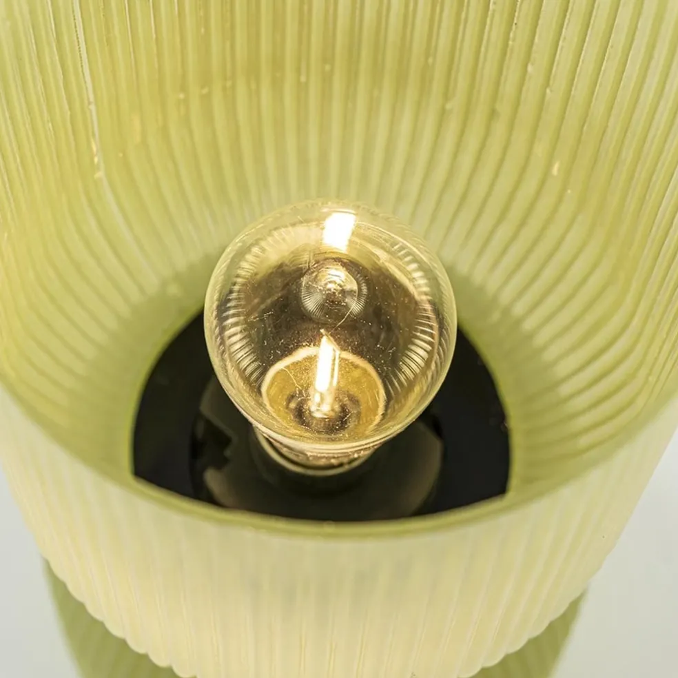 Dit tafellampje is gemaakt van glas. Het glas is geribbeld en licht olijf groen. De tafellamp heeft de vorm van een diabolo. Mooi detail aan deze lamp is dat het onderste deel van het glas mat is en het bovenste deel een subtiele glans heeft. De tafellamp werkt op 2x AAA batterij en is daarom overal toe te passen! Leuk in een landelijk of botanisch interieur. Op de slaapkamer, op de salontafel of op de vensterbank!