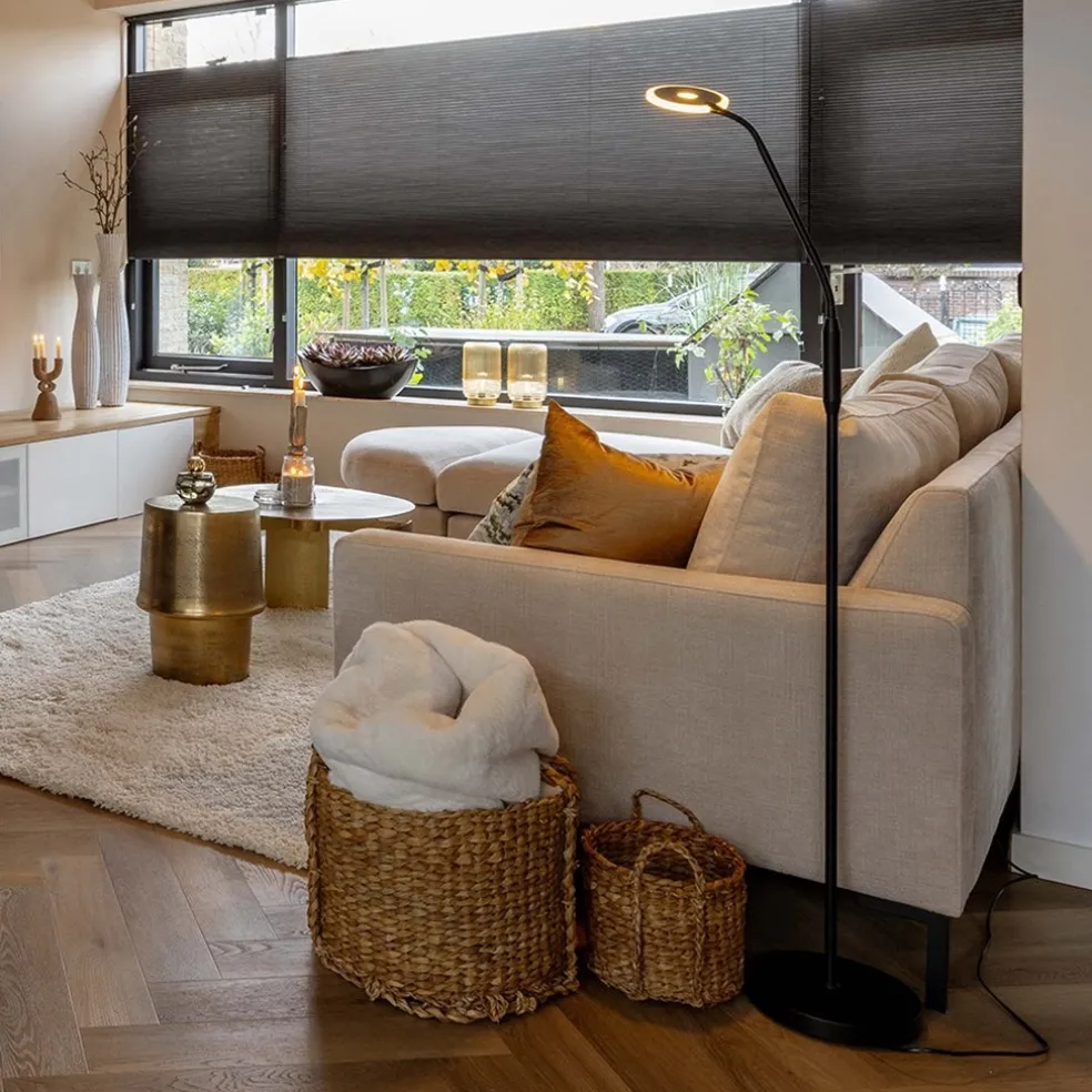 Een ideale vloerlamp voor zowel functioneel als sfeerlicht. Deze moderne leeslamp is van meerdere gemakken voorzien. Naast het strakke design heeft de leeslamp een flexibele arm zodat u de kap naar wens kunt verstellen. Deze is verder voorzien van LED verlichting die dimbaar is middels de pushdimmer op het armatuur. De verlichting is zowel in intensiteit als kleur te dimmen. Zo kunt u gemakkelijk schakelen tussen licht om bij te lezen of een sfeervol licht voor bij een borrel. De led verlichting heeft een mooi modern design. De vloerlamp is voorzien van een snoer van 210 CM, de schakelaar bevindt zich op het armatuur zelf.