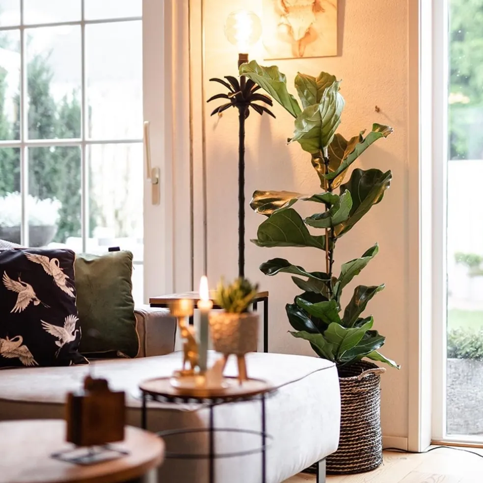 Deze leuke vloerlamp past helemaal bij de trends van nu. De mat zwarte lampvoet Armata is gemaakt in de vorm van een palmboom, inclusief de bladeren van de palm. Boven de bladeren steekt de fitting uit waar de kap op moet worden bevestigd. De palmboom vloerlamp matcht perfect bij de botanische trends en combineert mooi bij diverse kleuren. Zo kunt u met diverse kappen een mooie combinatie maken. De kap en de lichtbron worden niet meegeleverd. De zwarte palm lampvoet van Light and Living is voorzien van een zwart snoer van 195 cm, met een voetschakelaar op 40 cm van de voet.