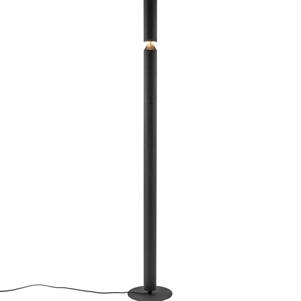 Strakke mat zwarte vloerlamp. Deze staande lamp past goed in de industriële of design interieurstijl. De simpelheid van de vloerlamp maakt hem heel strak en de grofheid van de afwerking weer stoer. De vloerlamp heeft zowel aan de bovenkant als aan de onderkant van het kleine kapje een lichtbron. Deze zijn apart van elkaar te bedienen met de knopjes die op het armatuur zitten. De staande lamp wordt zonder lichtbronnen geleverd.