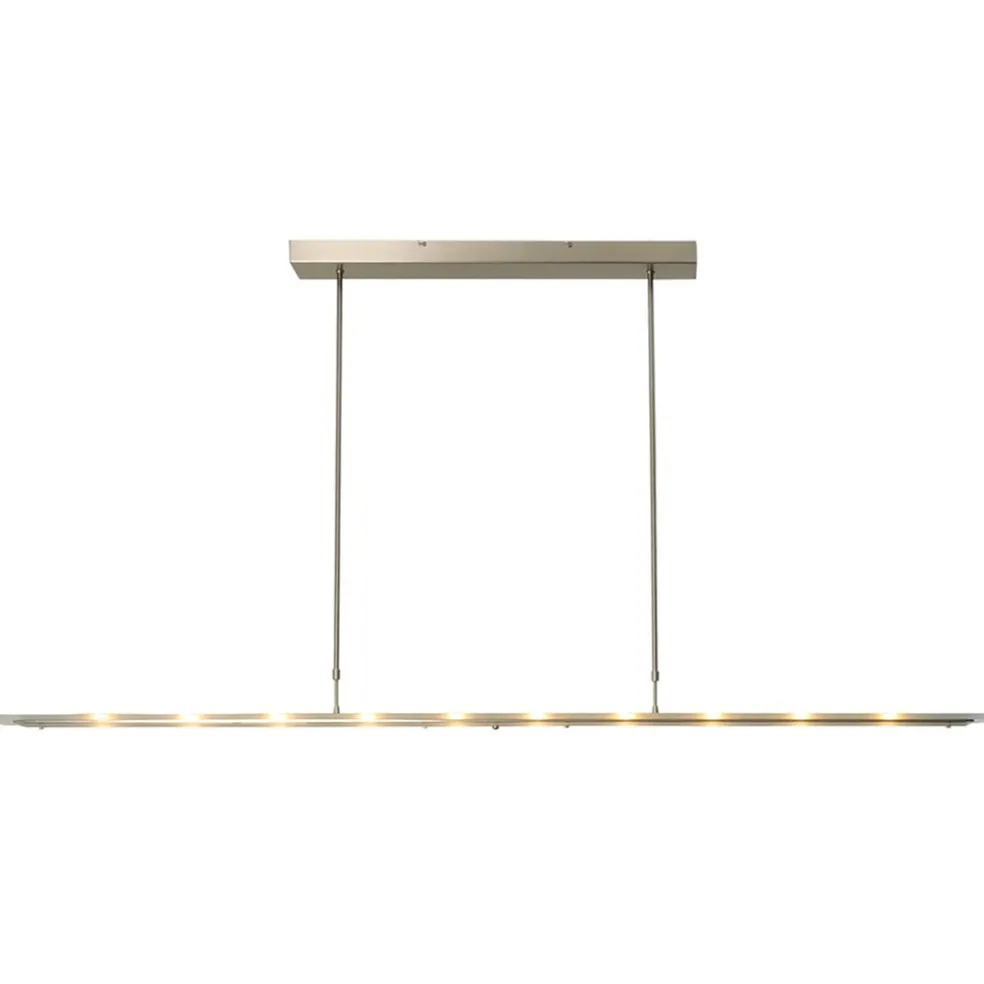Een prachtige hanglamp met een hoog design gehalte. Deze moderne hanglamp is voorzien van LED met een dim to warm functie. Door middel van de pushdimmer op het armatuur creëert u gemakkelijk de gewenste lichtintensiteit en kleurtemperatuur tussen de 2200 en 2700 Kelvin. Met 5040 lumen geeft de luxe hanglamp een goede lichtopbrengst. Ideaal voor boven een eettafel of bureau. De lamp is naast de eetkamer dan ook prima geschikt voor een kantoorruimte. De langwerpige lamp is uitgevoerd in het nikkel en voorzien van helder glas. Deze combinatie geeft de hanglamp echt een moderne en luxe uitstraling en maakt de lamp ook geschikt voor diverse woonstijlen. De hanglamp is verstelbaar in hoogte en heeft een minimale hoogte van 78 cm, en een maximale hoogte van 145 cm.