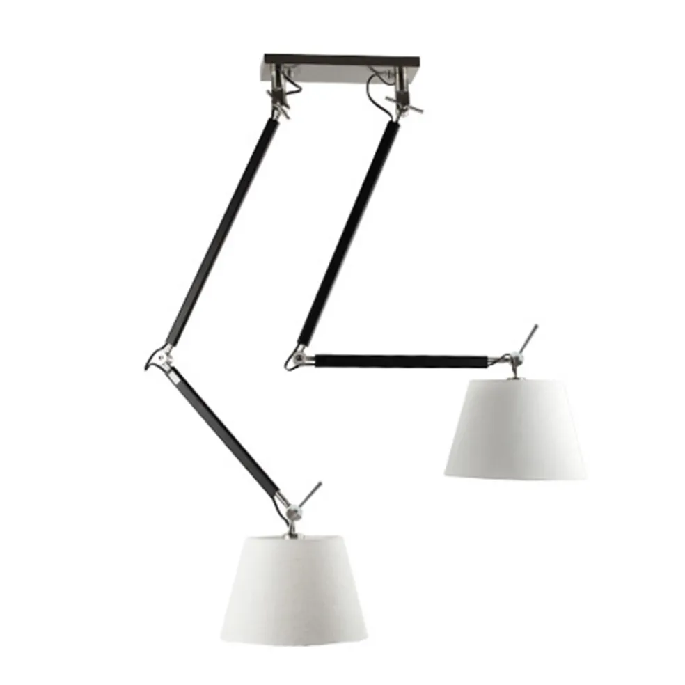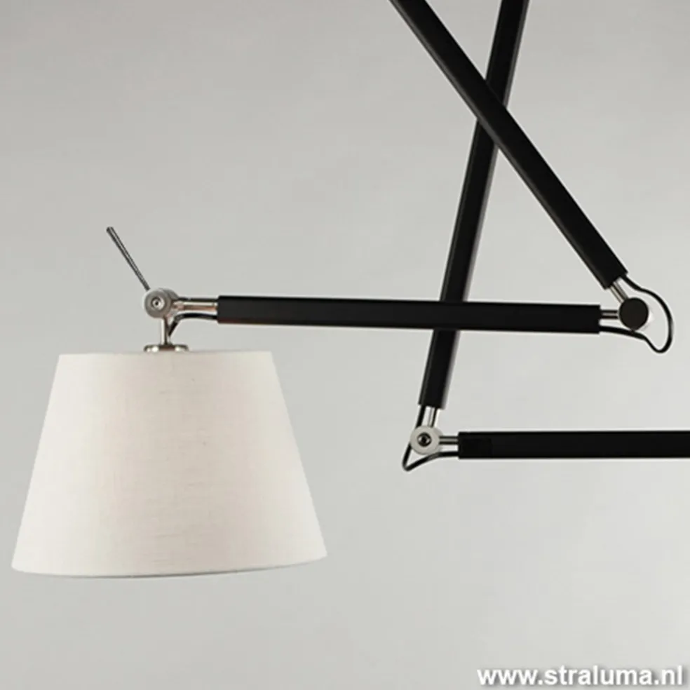 Super praktische hanglamp/plafondlamp met verstelbare armen, hierdoor kunt u deze lamp naar wens verstellen. Mooi design met zwart en staal gecombineerd, dit geeft het geheel een mooie strakke uitstraling. De kappen zorgen voor sfeer en een zacht tintje. Deze verstelbare plafondlamp is bij de kap en plafondbevestiging draaibaar en kantelbaar, tussen de stangen zit ook een scharnier. Door deze mogelijkheden is de lamp in allerlei houdingen in te stellen. Ideaal voor boven de eettafel.