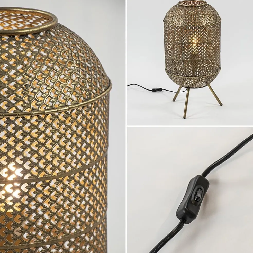Het leuke aan deze Oosterse lantaarn is dat deze op diverse manieren is te gebruiken. Door z’n grootte kan deze zowel als tafellamp en vloerlamp worden gebruikt. De Oosterse lantaarn is volledig van metaal en voorzien van een decoratief dessin. Het metaal is uitgevoerd in het mat goud wat mooi past in een Oosterse of landelijke setting. De ronde lantaarn is van boven en onder open en wordt ondersteund door de drie metalen pootjes. De gouden vloer/tafellamp is voorzien van een zwart snoer met een lengte van 180 cm, en een knipschakelaar op 35 cm van de lamp. De lichtbron wordt niet meegeleverd, deze is exclusief.