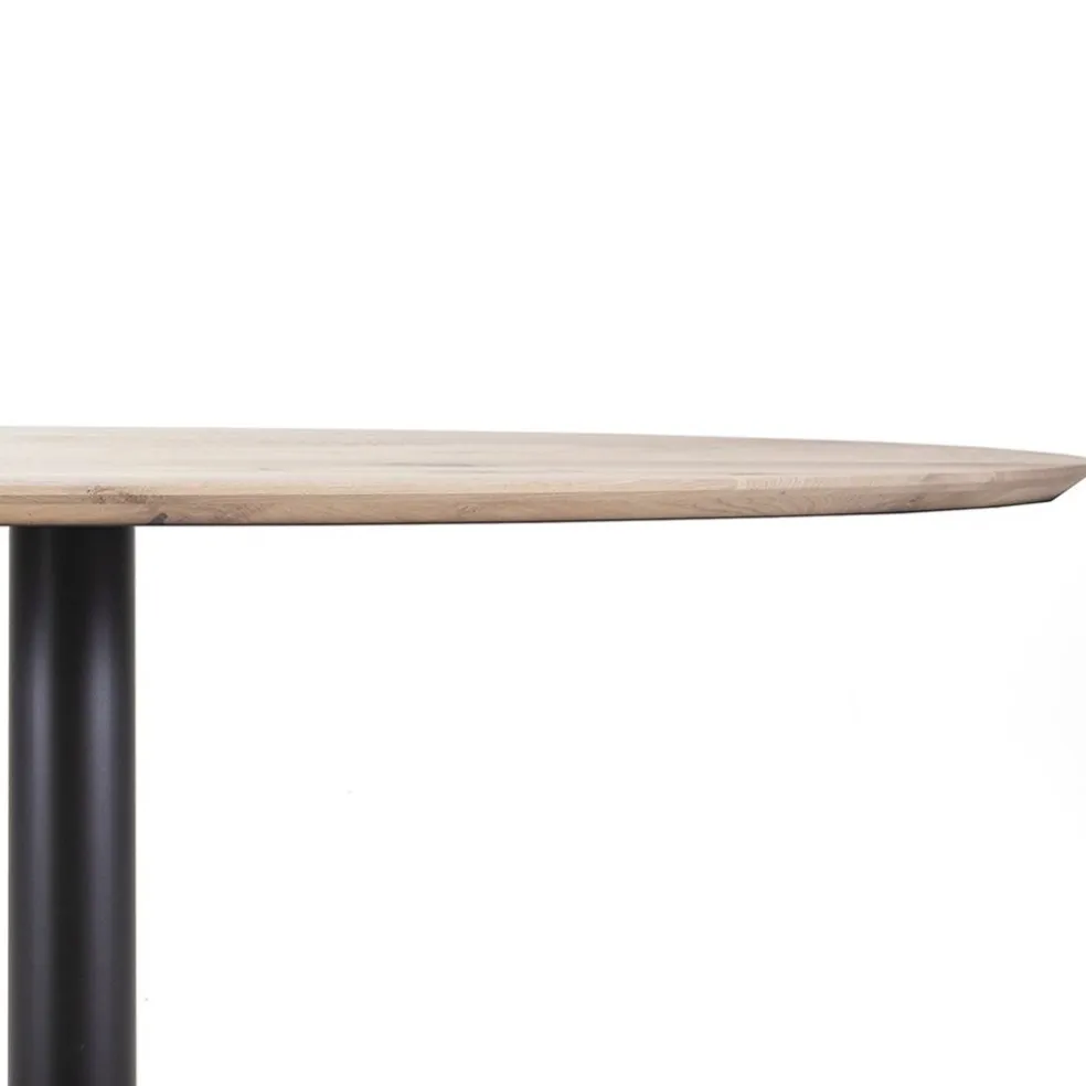 Een prachtige ovale eettafel met een eiken houten blad. Het blad is uitgevoerd in de kleur naturel en is gelakt als afwerking. Het eiken blad heeft een afmeting van 300×120 cm en wordt ondersteund door een stevige metalen poot met een zwarte coating. De ovale eettafel staat prachtig in een hotel chic of robuust interieur en biedt genoeg ruimte van 6 tot 8 stoelen.