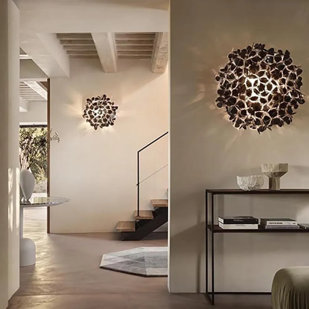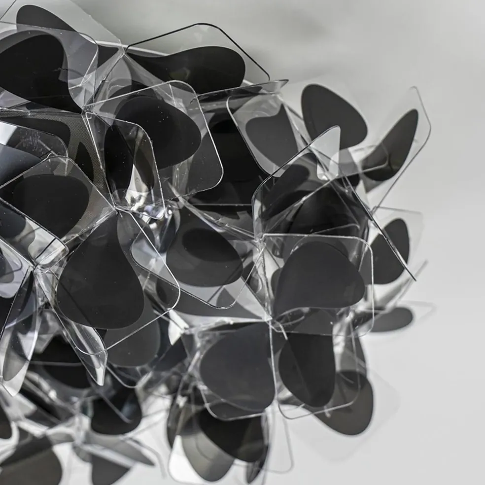 Een prachtig design dat volledig met de hand wordt samengesteld. De plafondlamp heeft een speels ontwerp dat met precisie wordt gemaakt. De ronde plafondlamp is uitgevoerd in het zwart wat de lamp een extra strakke en glamoureuze uitstraling geeft. De lamp kan zowel worden toegepast als plafondlamp en wandlamp. De kap wordt met magneten op de bevestiging geplaatst. De kap is van binnen voorzien van 2 E14 lichtpunten.