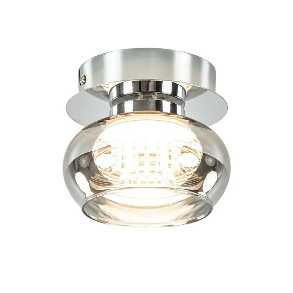 Een leuke kleine plafondlamp met een groot effect. De chromen plafondlamp is voorzien van LED en is afgewerkt met een smoke glazen kap. Het smoke glas heeft een titanium look die zorgt voor een spiegelend effect en wat transparant kleurt zodra de lamp wordt ingeschakeld. Het heldere binnenglas geeft de kap extra diepte en zorgt voor een mooi effect. De LED-plafondlamp geeft met 2700 Kelvin een sfeervolle warm witte verlichting en is in diverse ruimtes toe te passen. Zo past de moderne plafondlamp door zijn formaat erg leuk in een toilet of hal.