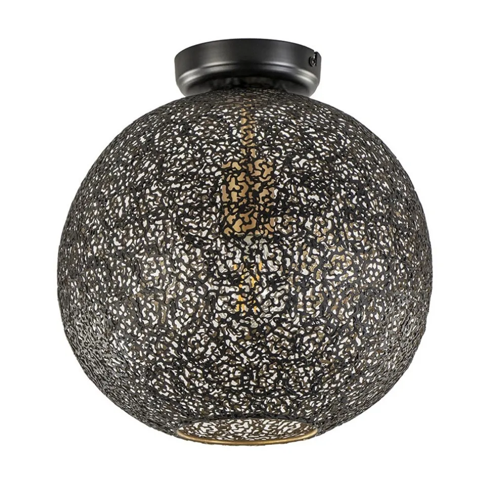 Stoer met een chique uitstraling. Deze moderne plafondlamp doet een beetje denken aan koraal en is gemaakt uit kleine metaaldeeltjes die samen de ronde kap vormen. Het metaal is afgewerkt met een mat zwarte finish aan de buitenzijde en een gouden finish aan de binnenzijde. Het goud zorgt voor een luxe chique uitstraling en creëert tevens een sfeervolle warme gloed. Ook de fitting is afgewerkt in de kleur goud. De zwart gouden bol is bevestigd op een ronde metalen bevestiging. De moderne plafondlamp wordt geleverd zonder lichtbron (E27).