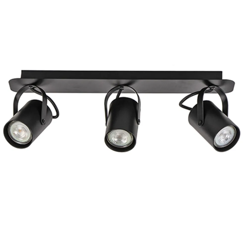 Neutraal van look en daardoor gemakkelijk toepasbaar in diverse woonstijlen. De 3-lichts opbouwspot is van metaal en uitgevoerd in mat zwart. De metalen kapjes zijn los van elkaar te verstellen door ze te draaien en te kantelen. Ideaal in een smalle lange ruimte als de hal of een slaapkamer. Het zwarte kapje hangt aan een beugel die aan de bevestiging vastzit. Omdat het snoer zichtbaar is, is er gekozen om een mooi stof omwonden snoer te gebruiken. De plafondbevestiging is afgewerkt met een bredere plaat waarbij de hoeken zijn afgerond, iets dat mooi past bij de ronde vormen van de rest van de plafondspot.