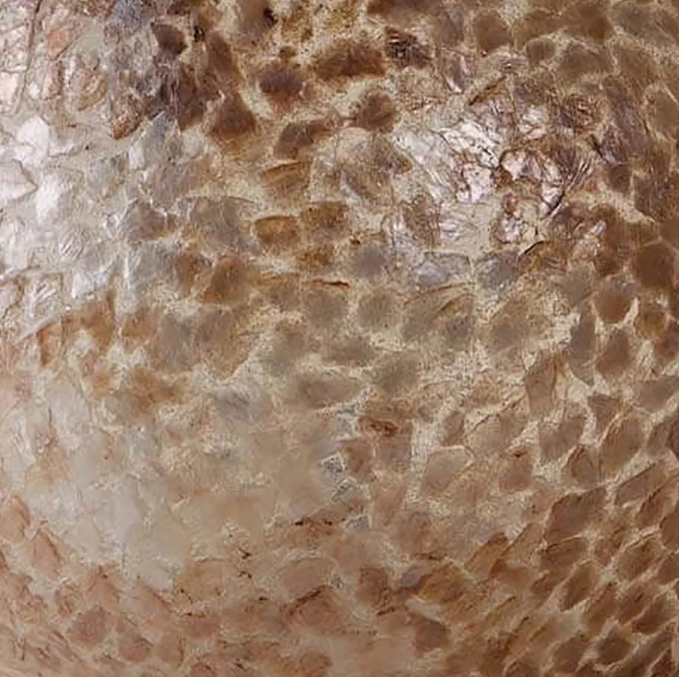 Sfeervolle tafellamp bol. Deze tafellamp is gemaakt van gebroken schelpen. Leuk om te zien wanneer hij niet brand en heel sfeervol als hij wel brand. Dit is geen tafellamp om bij te lezen, maar echt meer om een sfeer te creeëren in de woonruimte. De kleuren zijn heel gemeleerd van creme-beige-bruin en goud, uitermate geschikt voor een beach-ibiza look of lifestyle interieur.