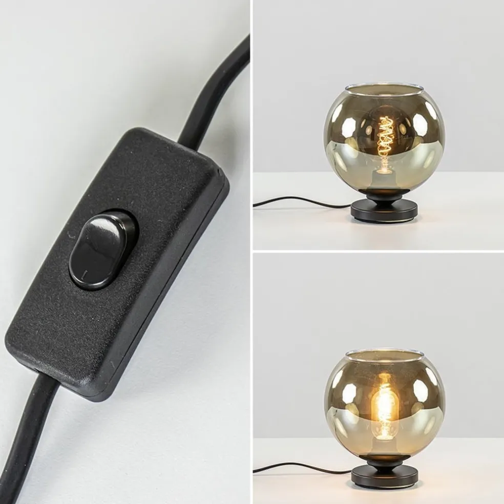Een sfeervolle tafellamp met een luxe uitstraling. De tafellamp bestaat uit een metalen voet die is uitgevoerd in het mat zwart en een smoke glazen bol met een doorsnede van 20 cm. Het donkere glas geeft een chique luxe uitstraling die mooi is toe te passen in diverse woonstijlen. De tafellamp past perfect op een dressoir, kast of zelfs het nachtkastje. De ronde voet is voorzien van een zwart snoer met een lengte van 180 cm, de knipschakelaar zit op 65 cm in het snoer. De tafellamp smoke glazen bol 20 cm wordt geleverd zonder lichtbron (E27).