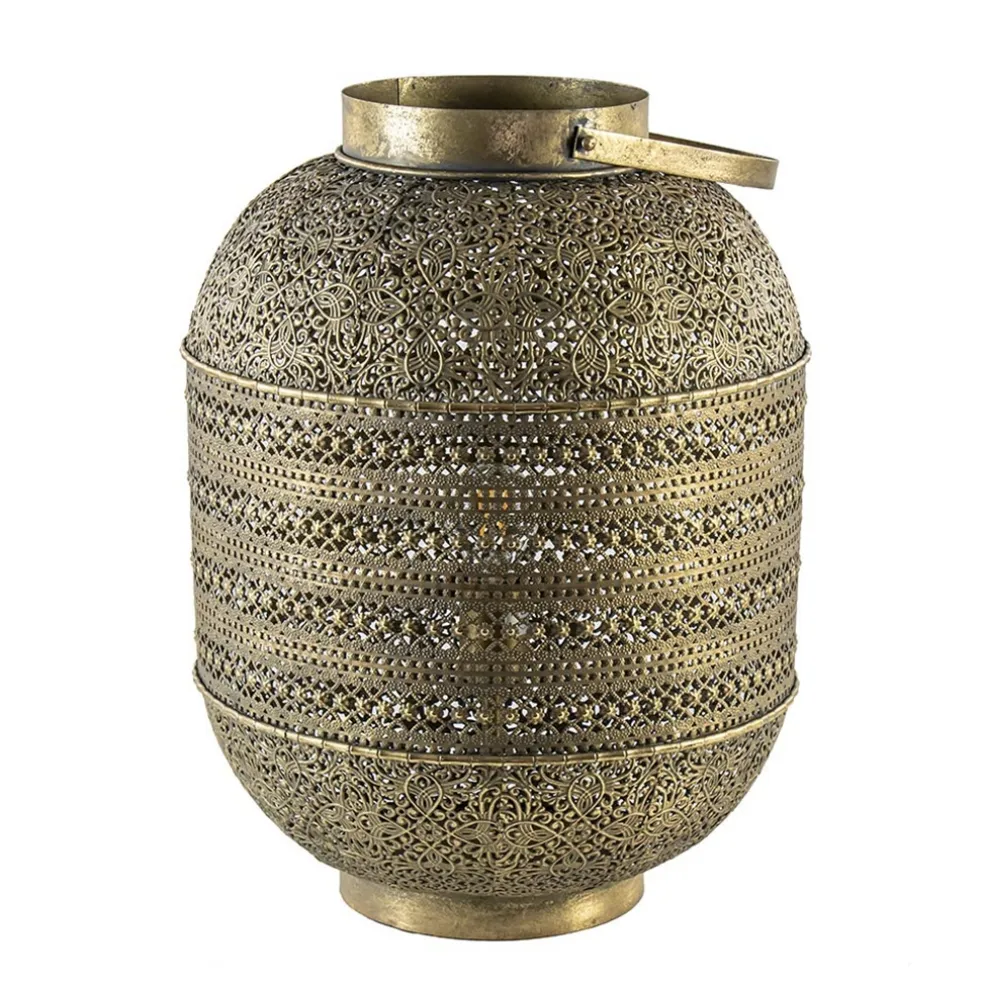 Met deze grote tafellamp creëert u al gauw een Oosterse sfeer in huis. De ronde lantaarn tafellamp is volledig van metaal en voorzien van een decoratief dessin. Het dessin geeft de tafellamp echt die Oosterse uitstraling en zorgt ook voor een mooi effect wanneer de lamp wordt ingeschakeld. De grote lantaarn is uitgevoerd in het goud en voorzien van een antieke afwerking wat de lamp nog meer karakter geeft. Door het formaat past de lamp mooi op een dressoir, maar ook op de grond naast de bank zorgt deze sfeervolle lantaarn voor een leuk effect. Van binnen is de lamp ook goudkleurig wat zorgt voor een extra warme verlichting en aan de buitenzijde is de lantaarn voorzien van een hengsel wat de lamp helemaal afmaakt. De gouden Oosterse tafellamp is voorzien van een zwart snoer van 180 cm, met een knipschakelaar op 35 cm van de lamp, en wordt geleverd zonder lichtbron (E27).