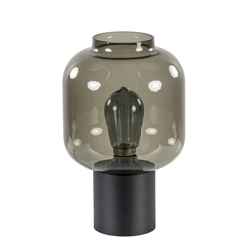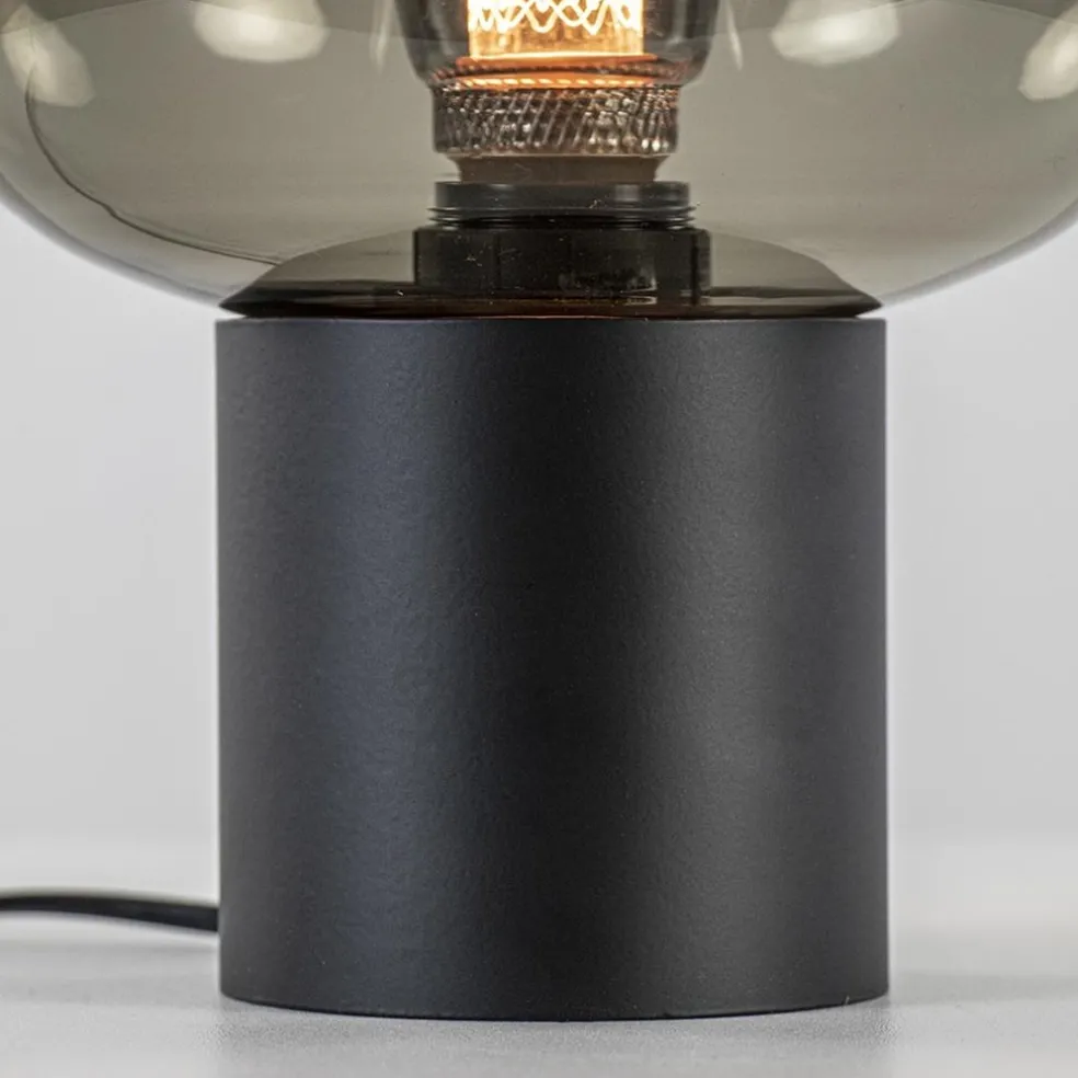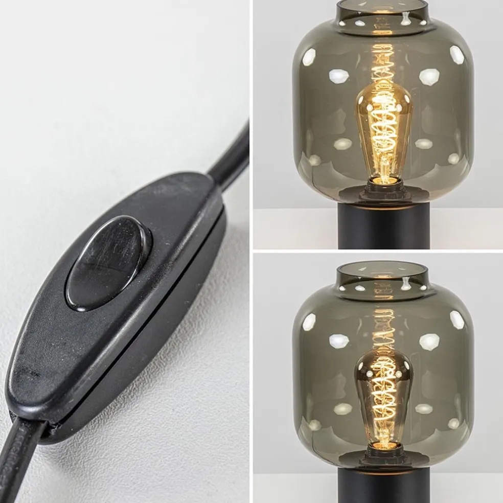 Een mooie moderne tafellamp met een luxe uitstraling. De kleine tafellamp is voorzien van een mat zwart metalen voet die is gecombineerd met een smoke glazen kap. Het donkere smoke glas geeft een luxe uitstraling die mooi past binnen de huidige woontrends. De tafellamp heeft een zwart snoer van 180 cm, waarbij de knipschakelaar zich op 60 cm van de lamp bevindt. De moderne smoke glazen tafellamp wordt geleverd zonder lichtbron (E27).