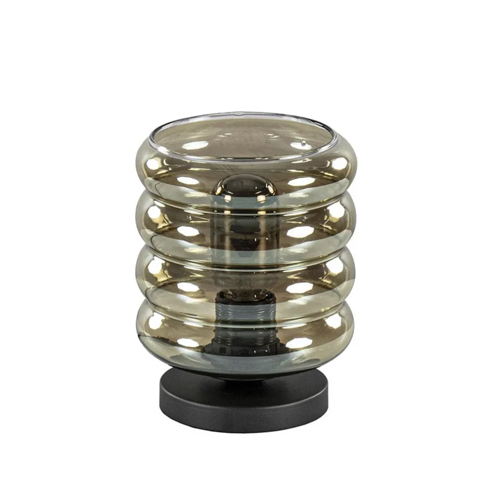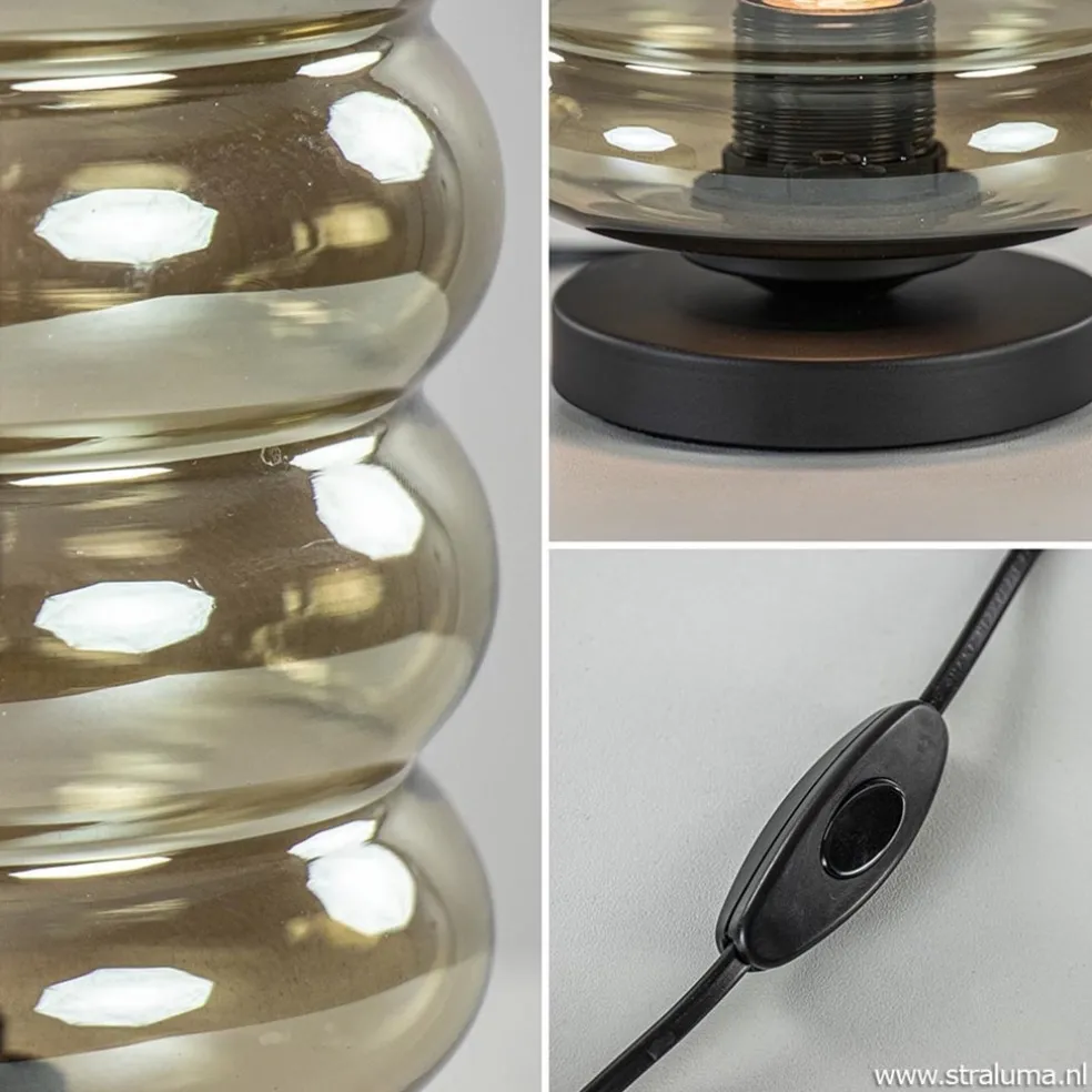 Deze moderne tafellamp is voorzien van een smoke glazen kap die zorgt voor een luxe en sfeervolle uitstraling. Het donkere glas wordt ondersteund door een kleine zwart metalen voet waarbij het glas op de fitting wordt vastgedraaid. De zwarte voet heeft een snoer van 185 cm met een schakelaar op 65 cm van de lamp. Deze smoke glazen tafellamp wordt geleverd zonder lichtbron (E27).