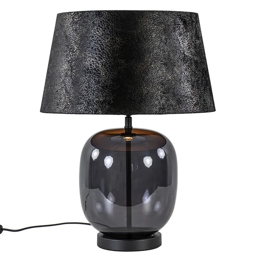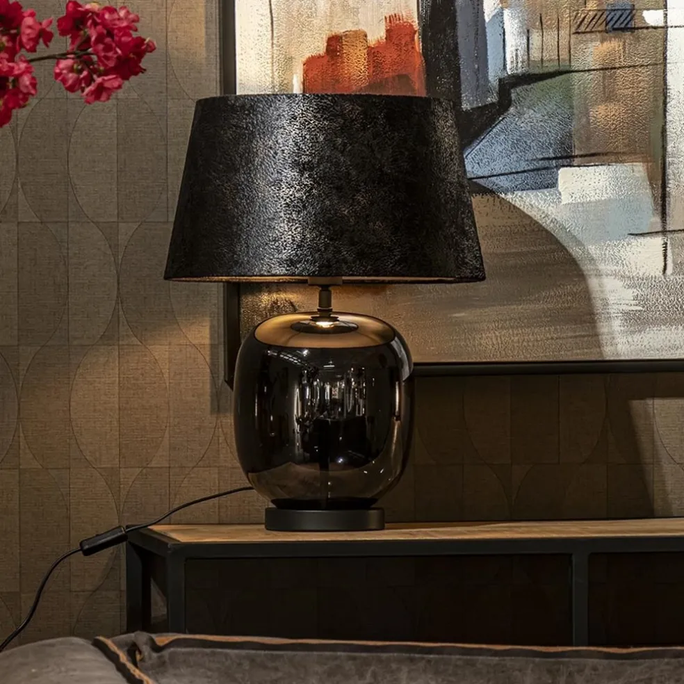 Deze prachtige lamp heeft een chique en luxe uitstraling door de combinatie van de materialen en kleuren. Zo heeft de tafellamp een glazen voet die is uitgevoerd in het zwart. Dit is gecombineerd met een stoffen kap in het zwart/taupe met een glinstering erin. De combinatie maakt de tafellamp perfect geschikt voor een hotel chic, strak klassiek of luxury interieur. De kap wordt ondersteund door een kogelgewricht zodat u de kap goed recht kunt zetten. De glazen tafellamp met kap heeft een zwart snoer met een lengte van 180 cm en een knipschakelaar op 30 cm. De chique tafellamp wordt geleverd zonder lichtbron.