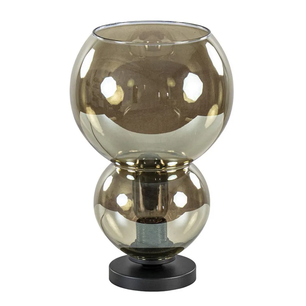 Een sfeervolle tafellamp met een uniek gevormde glazen kap. Deze moderne tafellamp is voorzien van een smoke glazen kap die zorgt voor een luxe en sfeervolle uitstraling. Het donkere glas wordt ondersteund door een kleine zwart metalen voet waarbij het glas op de fitting wordt vastgedraaid. De zwarte voet heeft een snoer van 185 cm met een schakelaar op 65 cm van de lamp. Deze smoke glazen tafellamp wordt geleverd zonder lichtbron (E27).