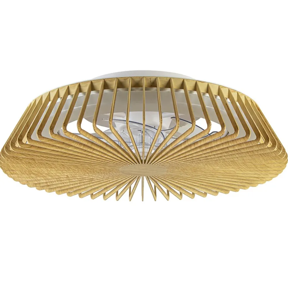Een moderne design plafondventilator met LED zoals we deze nog niet eerder hebben gezien. De ronde ventilator oogt meer als een plafondlamp dan een ventilator maar deze heeft beide functies in één. De fraaie kap met hout-look geeft de plafondventilator een frisse uitstraling. De moderne plafondventilator, met ledlichtbron, is voorzien van diverse functies. Zo kunt u de kleurtemperatuur kiezen tussen de 2700 en 5000 Kelvin en kunt u de lamp eenvoudig dimmen. Dit bediend u allemaal gemakkelijk met de bijgeleverde afstandsbediening of via een app op uw mobiele telefoon. Deze verbindt u d.m.v. Bluetooth met de lamp zodat u vanaf uw bank, bed of luie stoel snel de gewenste instelling kunt maken. Kortom, een ideale plafondlamp en ventilator in één met een mooie design uitstraling.