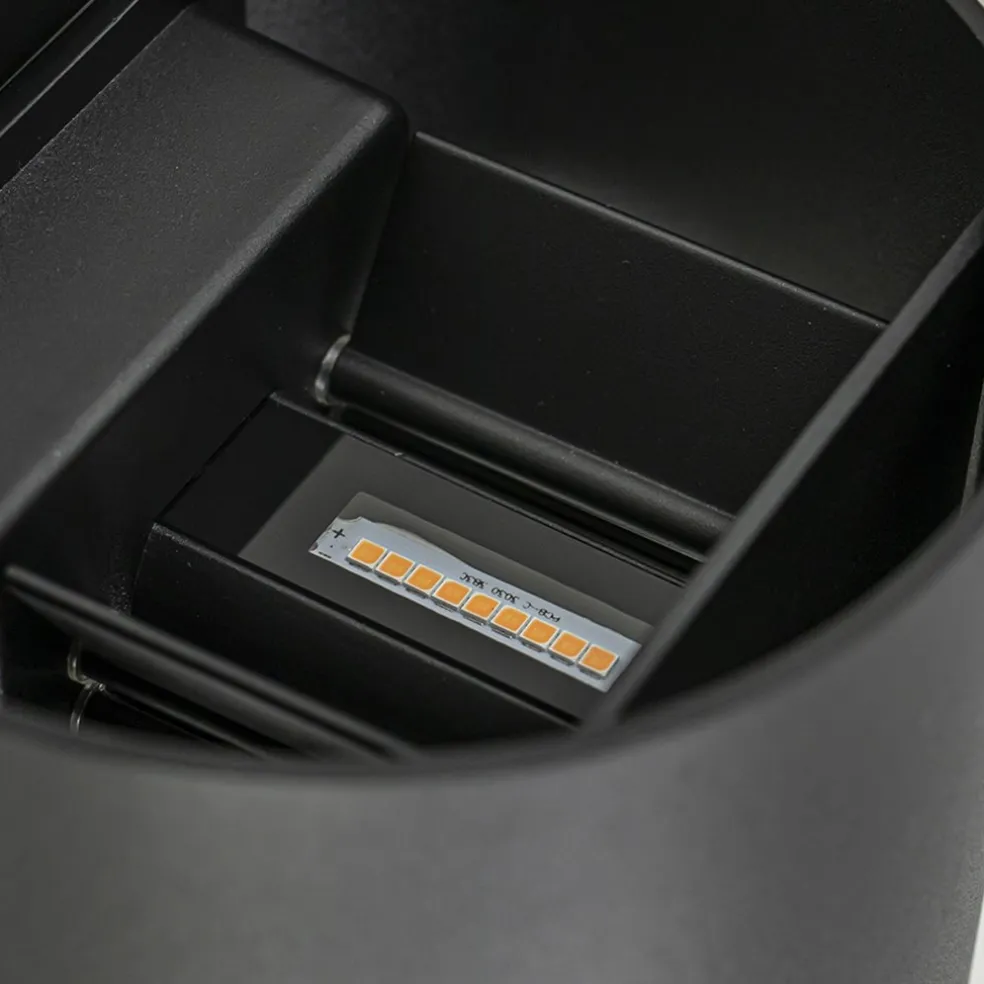 Een subtiele en sfeervolle toevoeging aan uw tuin. Deze kleine ronde wandlamp valt overdags bijna niet op, maar ’s avonds daarentegen des te meer. De zwarte aluminium wandlamp creëert een sfeervol zandloper effect op de muur of schutting en geeft dankzij z’n lumen van 1100 flink wat licht. Aan de binnenzijde kunt u kiezen om het licht meer naar boven of onder te bundelen. Zo kunt u iedere wandspot los van elkaar instellen voor een speels effect door heel de tuin. De moderne buitenlamp is voorzien van geïntegreerd LED zodat deze energiezuinig is en is IP54 goedgekeurd. De moderne buitenlamp is dimbaar middels een externe dimmer (exclusief).