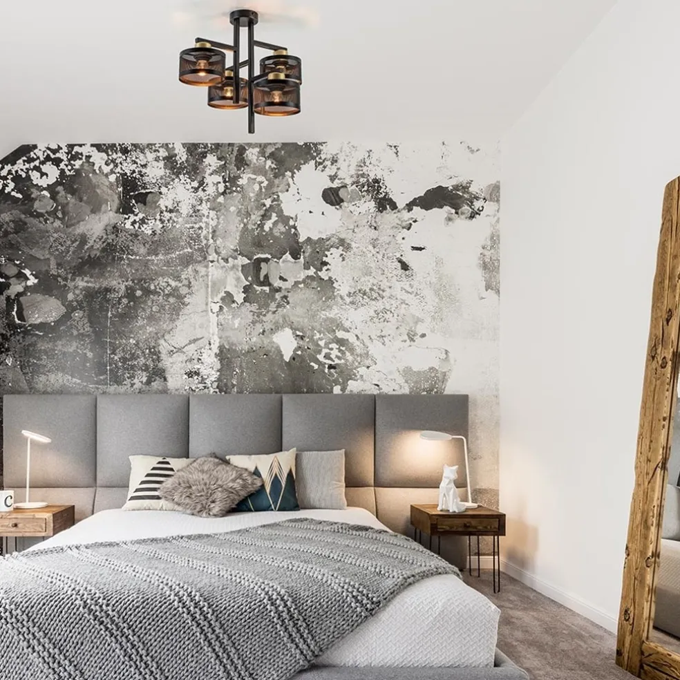 Een mooie toevoeging aan een slaapkamer, hal of woonkamer. Deze 4-lichts plafondlamp heeft een uniek design door het gebruik van diverse vormen. Het strak vormgegeven armatuur geeft de plafondlamp een moderne look die mooi is combineerd met ronde kappen. Extra detail zijn de gouden fittingen. Alles bij elkaar maakt de plafondlamp prima geschikt voor een landelijk interieur. De metalen plafondlamp heeft een mat zwarte afwerking, hierdoor vallen de gouden fittingen extra goed op. De zwart met gouden plafondlamp wordt geleverd zonder lichtbronnen en is dimbaar met een externe dimmer (exclusief).