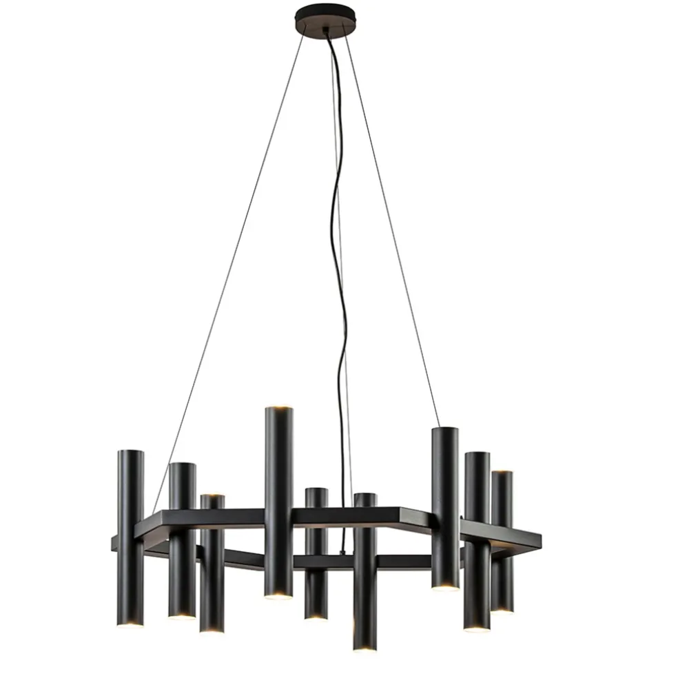 Deze stijlvolle hanglamp is een mooie toevoeging aan de eetkamer, hal of zelfs vide. De hanglamp is gemaakt van metaal en uitgevoerd in het mat zwart. De 12 lichtpunten zitten verdeeld over de 9 cilinders die zijn bevestigd op een 6-hoekig armatuur. 3 cilinders zijn ook aan de bovenzijde voorzien van een lichtpunt. Zo werkt de design hanglamp zowel als een up en downlighter. De hexagon hanglamp met cilinders heeft een hoogte van 130 cm en is naar wens in te korten. De designlamp is dimbaar middels een externe dimmer (exclusief) en wordt gelverd exclusief lichtbronnen.