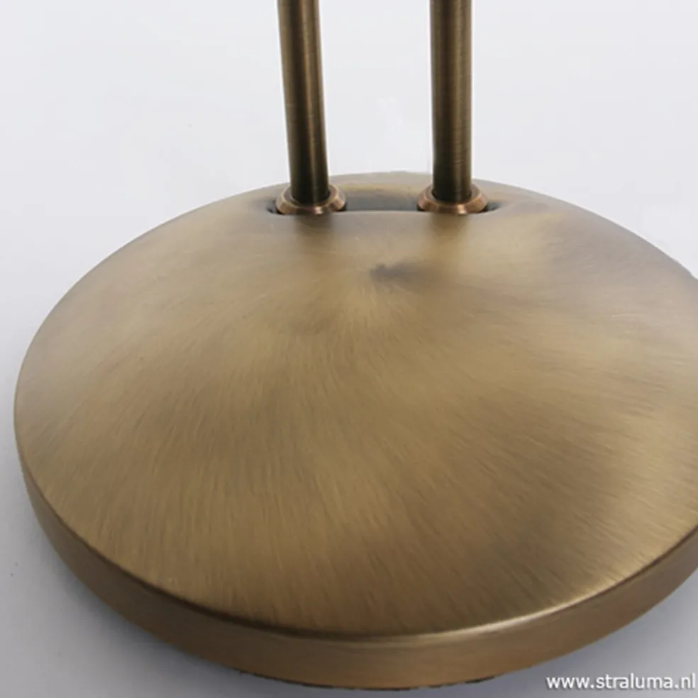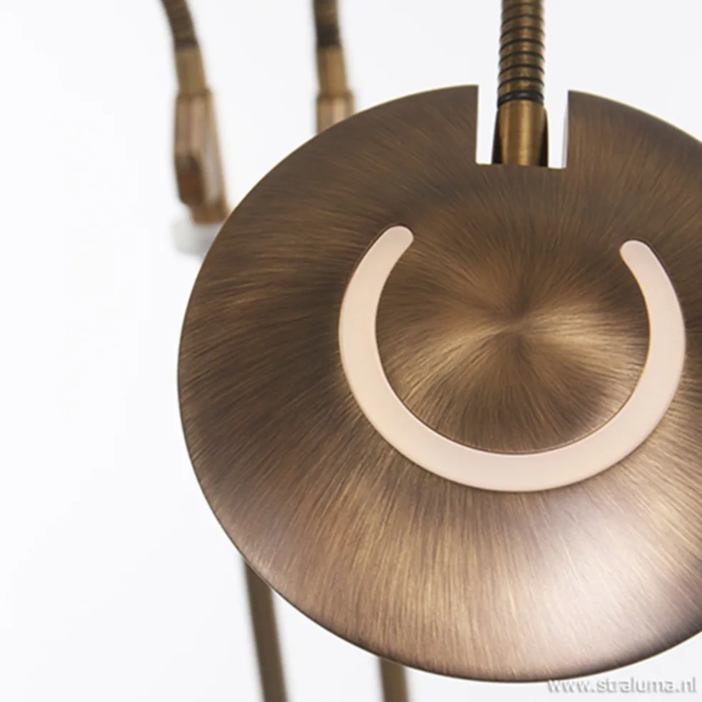 Een ideale vloerlamp voor de liefhebbers van een boek. Deze leeslamp verlicht niet één, maar zelfs twee plekken tegelijk. De kapjes zijn door de flexibele armen naar wens te stellen zodat u en uw partner goed licht heeft tijdens het lezen. Liever wat minder licht, dan dimt u gemakkelijk met de pushdimmer op de staande lamp. Ook die is voor beide kappen apart te bedienen, ideaal! De bronzen leeslamp heeft een ronde voet en heeft als extra sfeerverlichting een kleine strip boven op de kapjes.
