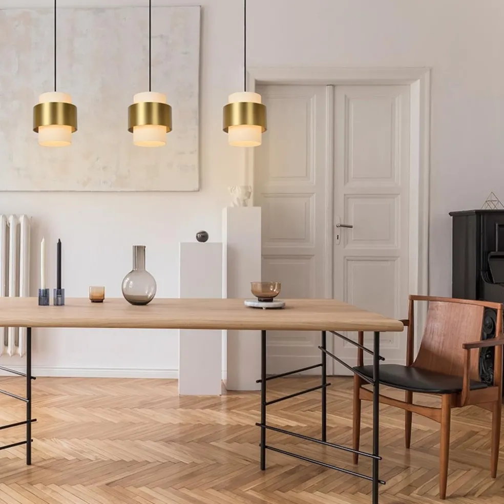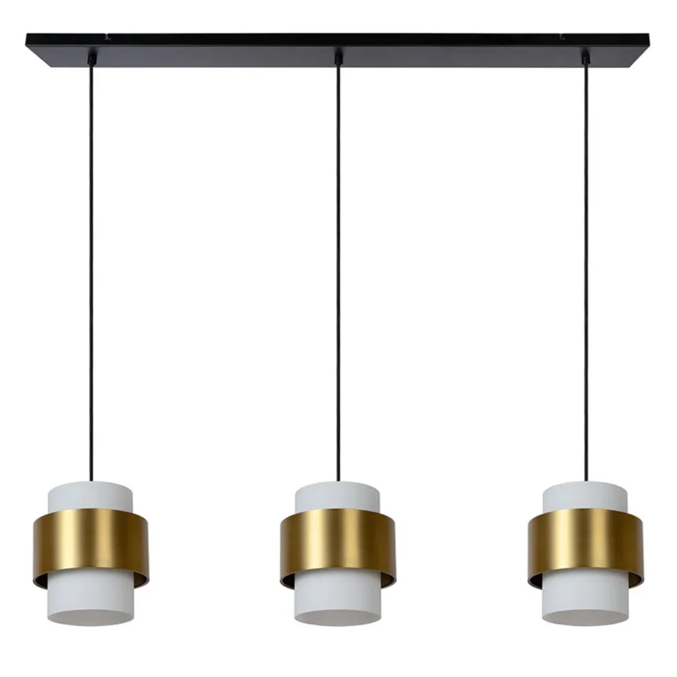 Klassiek en retro komen soms dicht bij elkaar. Zo ook in deze 3-lichts hanglamp. Het hedendaagse design maakt de lamp prima geschikt voor de huidige eetkamers. De hanglamp bestaat uit cilinder vormige opaal glazen kappen met daar omheen metalen mat gouden ringen. Het opale glas zorgt voor sfeervol diffuus licht en tevens dat u niet in de lichtbron kunt kijken. De ronde kappen hangen aan zwarte stof omwonden snoeren welke naar wens in hoogte zijn te verstellen. De hanglamp wordt aan het plafond bevestgd met een mat zwarte balk van 110 cm. De 3-lichts hanglamp mat goud met opaal glas is dimbaar middels een externe dimmer (exclusief) en wordt exclusief lichtbron geleverd.