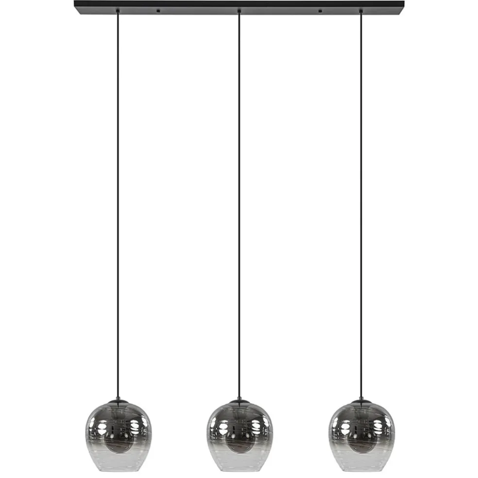 Modern met een chique, luxe uitstraling. Deze 3-lichts hanglamp maakt het interieur helemaal af. De eettafelhanglamp is voorzien van 3 smoke glazen kappen met een speciaal effect. Het verloop van licht naar donker in het glas in combinatie met het spiegelende effect geeft de hanglamp een luxe, stoere uitstraling. De smoke glazen kappen hangen aan zwarte stof omwonden snoeren die naar wens, gemakkelijk in te korten zijn. De luxe ogende hanglamp wordt aan het plafond bevestigd met een mat zwarte plafondplaat.