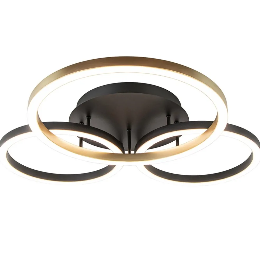 Een chique plafondlamp die prima past in diverse woonstijlen. De LED plafondlamp bestaat uit 3 ringen in diverse afmetingen die elkaar overlappen, dit geeft de lamp een speelse look. De ringen zijn uitgevoerd in het zwart en goud. De design plafondlamp is verder voorzien van een 3-standen dimfunctie. Dit houdt in dat u de lamp met de gewone wandschakelaar kunt dimmen, er is geen externe dimmer voor nodig. De techniek zit verwerkt in de lamp zelf en dimt een stap verder zodra u de wandschakelaar overhaalt. Door z’n grootte is de LED plafondlamp met ringen een mooi toevoeging voor een hal of slaapkamer.