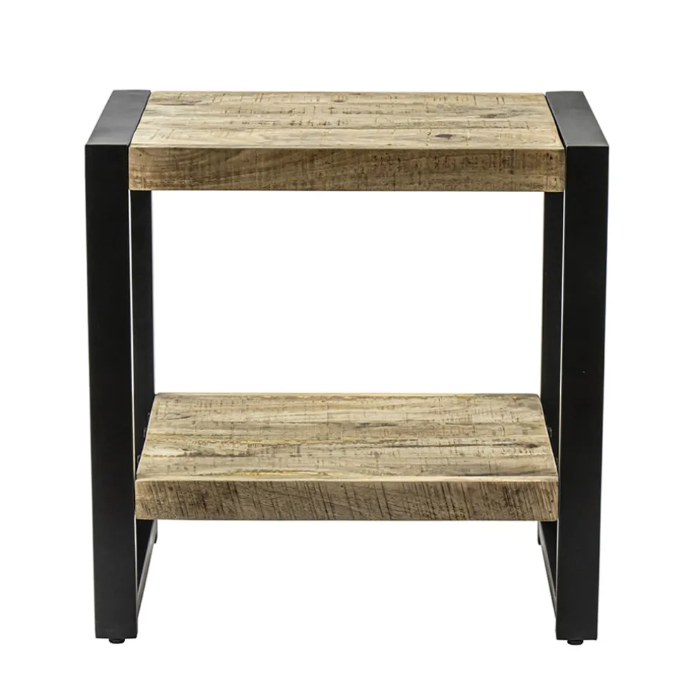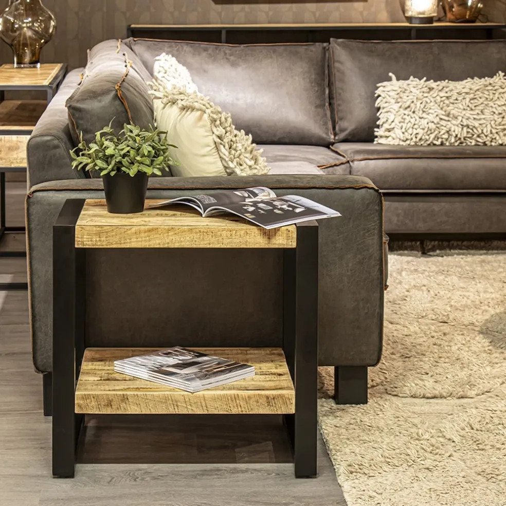 Simpele bijzettafel met een stoer uiterlijk. De bijzettafel bestaat uit 2 lagen. Beide hebben een mango houten blad met een mat zwart metalen frame. Het hout heeft een naturel finish. Het tafeltje kan ook dienen als nachtkastje.