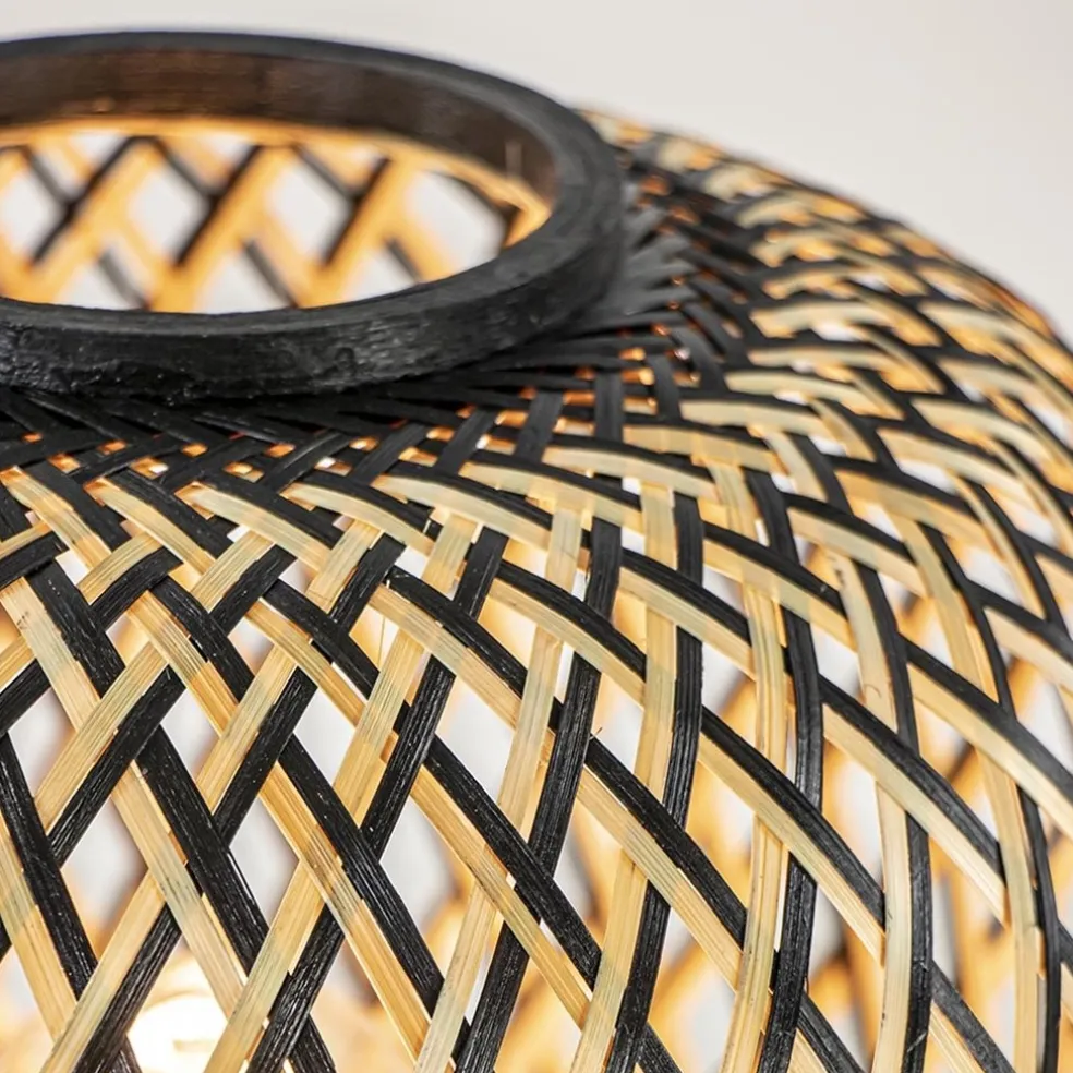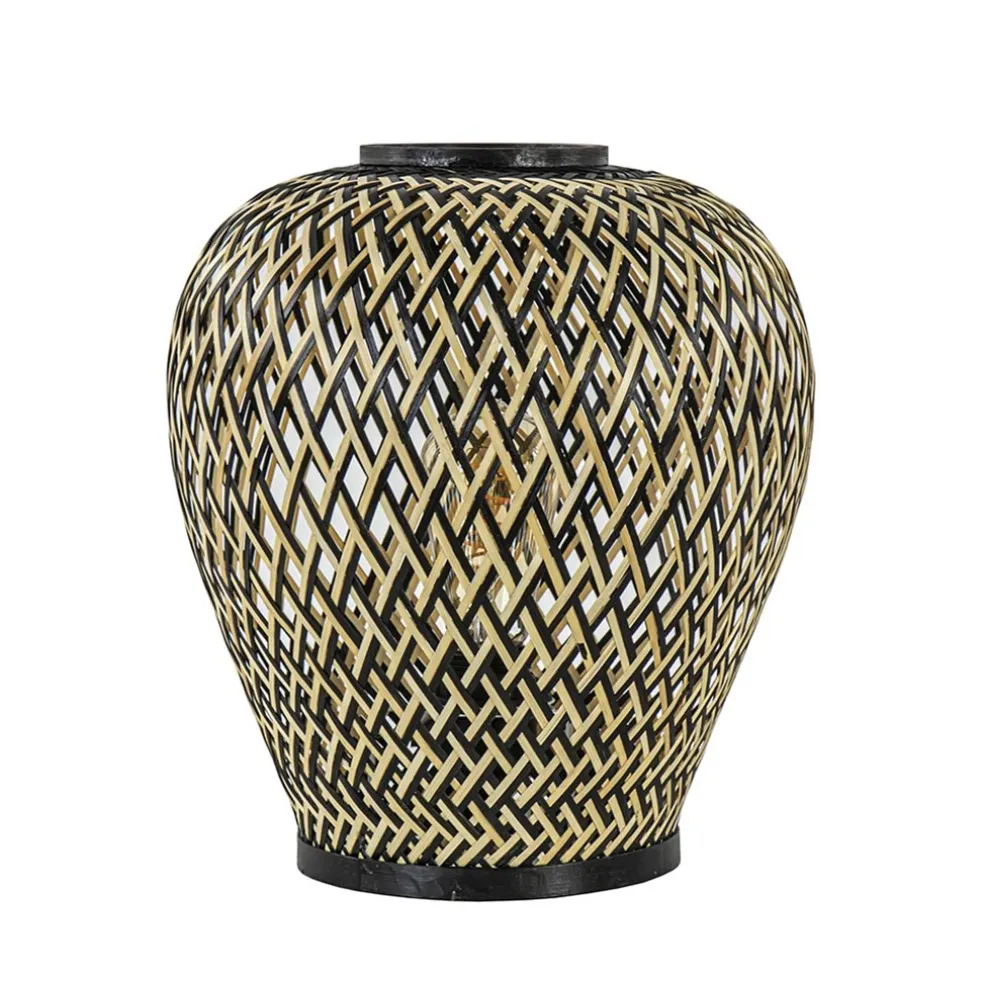 Ideaal voor een botanisch, Oosters of landelijk interieur. Deze tafellamp is volledig gemaakt van bamboe en uitgevoerd in het naturel met zwart. De tafellamp doet denken aan een vaas en heeft door de manier van vlechten een open structuur. De tafellamp is een sfeervolle toevoeging aan het interieur. De bamboe lamp is voorzien van een zwart snoer met een lengte van 180 cm. De schakelaar bevindt zich op 60 cm.