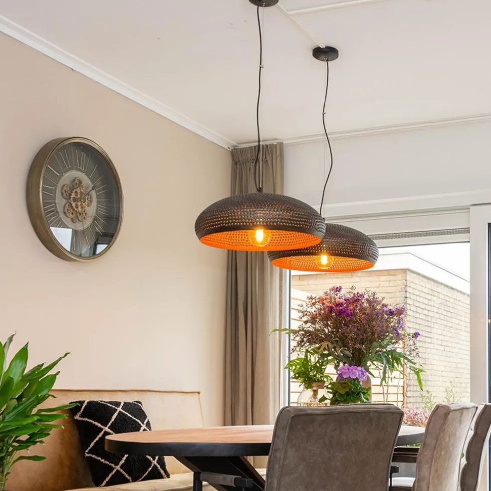 Een metalen hanglamp zoals je ze niet vaak ziet, deze ronde hanglamp. De geperforeerde stalen kap ziet eruit alsof deze in de olie is gedompeld wat de kap een unieke en robuuste look geeft. Door de kleur en het materiaal is de lamp te combineren in een industrieel maar ook een landelijk interieur. De metalen kap heeft een brons-gelige binnenzijde wat voor warme verlichting zorgt. De hanglamp hangt aan een ijzerdraad en het snoer die beide verwerkt zitten in de zwarte plafondbevestiging. Zowel het snoer als het ijzerdraad is in te korten.
