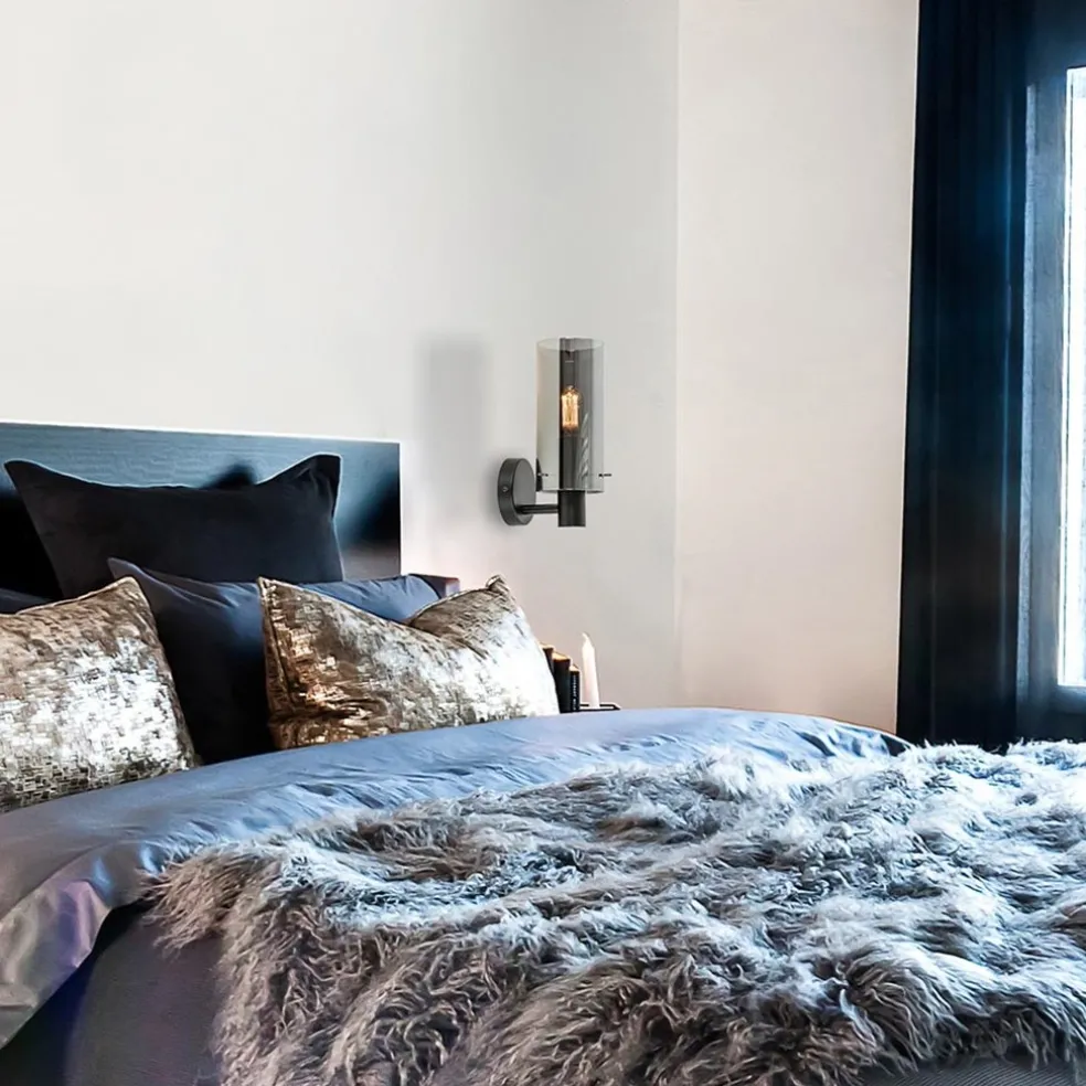 Chique wandlamp zwart met smoke glas cilinder