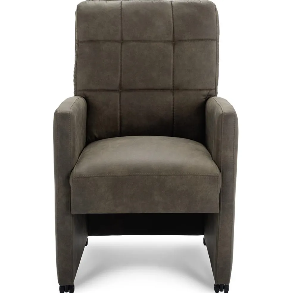 Een fijne stoffen eetkamerstoel met lederlook, perfect om mee aan tafel te zitten en heerlijk relaxed te natafelen. De armleuningen zorgen voor een ontspannen zitcomfort, net als de zachte zitting en rugleuning. De stoel is afgewerkt met wieltjes en op de rug voorzien van een handgreep zodat u de stoel gemakkelijk onder de tafel kunt rollen. Het stiksel in de rugleuning maakt de stoel helemaal af en geeft een robuust karakter. Deze landelijke eetkamerstoel past mooi bij een houten tafel en combineert prima in diverse woonstijlen.