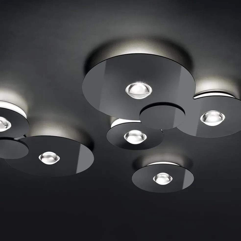 Een plafondlamp van Italiaans design. De plafonnière bestaat uit 3 ronde schijven die samen een geheel vormen. Iedere schijf heeft een andere maat waardoor het geheel een speelse vorm krijgt. In het midden van de schijven bevindt zich een LED unit. Deze geeft zowel direct als indirect licht. De design lamp geeft met 4200 lumen een flinke lichtopbrengst. De ronde schijven zijn afgewerkt in het glossy zwart wat een modern uiterlijk geeft aan de plafondlamp.