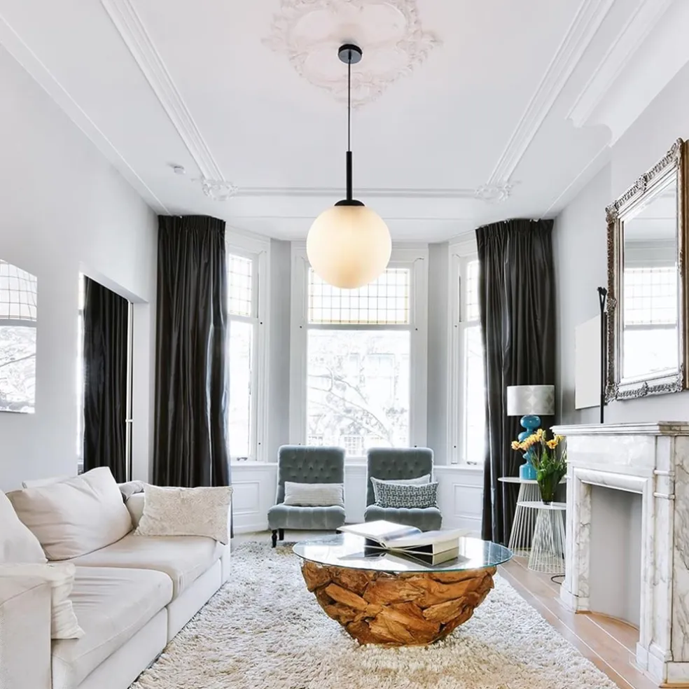 Elementen uit de jaren 30 zijn weer helemaal trending. Zo ook verlichting. De art deco stijl is weer veel terug te vinden waarbij het opaal witte glas kenmerk is. Deze grote bol voldoet helemaal aan de trend en is een mooi statement in huis. De grote bol wordt bevestigd op een mat zwarte metalen fitting en hangt aan een zwart stof omwonden snoer. De retro hanglamp heeft een maximale hoogte van 180 cm en is gemakkelijk in te korten. Door de grootte van het glas is de lamp voorzien van een drie E27 fittingen. De lichtbronnen zijn exclusief.