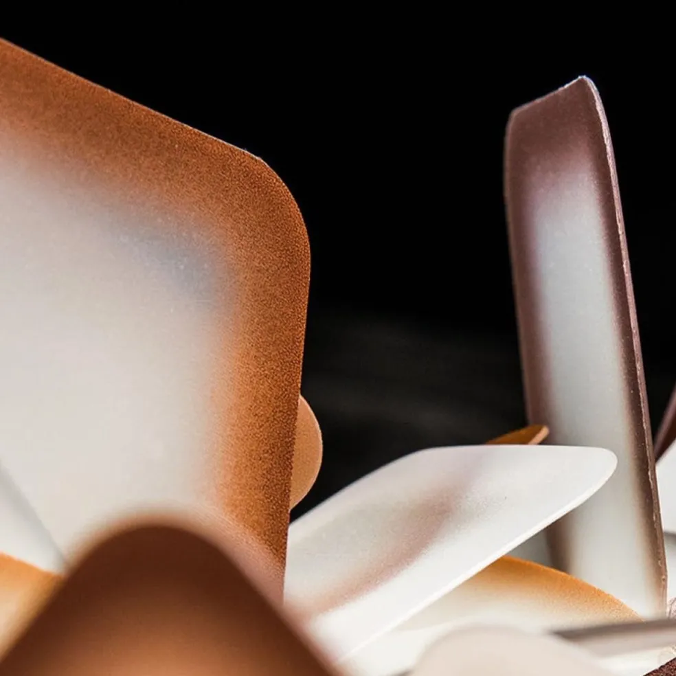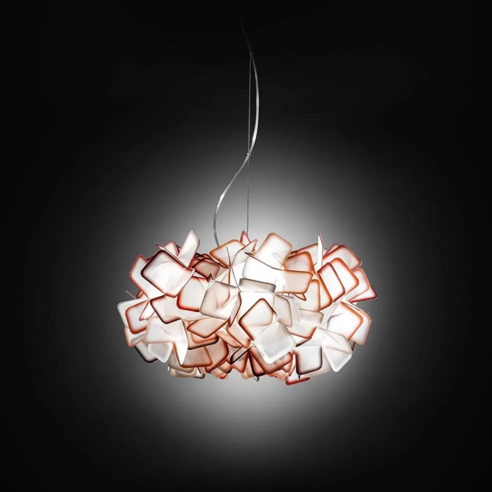 Prachtig Italiaans design en vervaardigd van hoogwaardig kunststof. Deze prachtige design hanglamp is als een wolk van licht. Hij neemt bezit van de ruimte, en geeft deze een heel nieuw karakter. De elementen lijken volledig willekeurig samegesteld, maar volgen een zeer precieze compositie. Deze sprankelende design lamp heeft een mooie balans van transparant en semi-transparant, in een oranje kleur. De lamp hangt met een transparant snoer en staalkabel aan de witte plafondbevestiging.