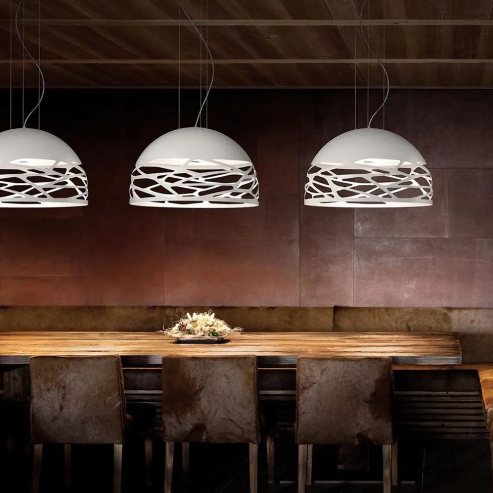 Deze prachtige koepel vormige hanglamp is een sterk staaltje Italiaans design. Staat super in een design of modern interieur. Uitgevoerd in wit metaal met een mat glazen diffuser, zo kijkt u niet direct in de lichtbronnen. De mooie opengewerkte rand geeft een prachtig licht/schaduw spel zowel wanneer de lamp brand als wanneer deze uit is. Met deze design hanglamp maakt u direct een statement.